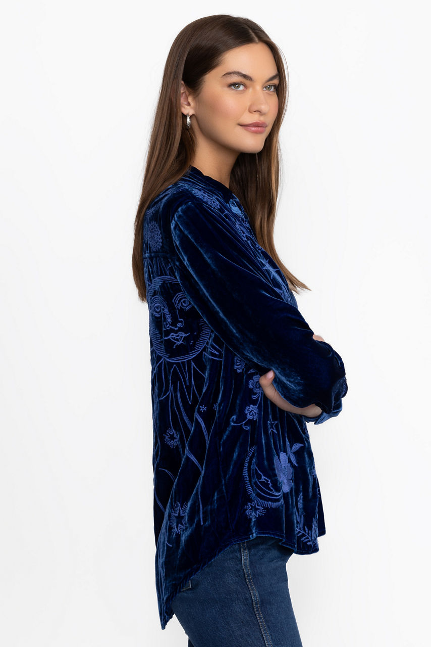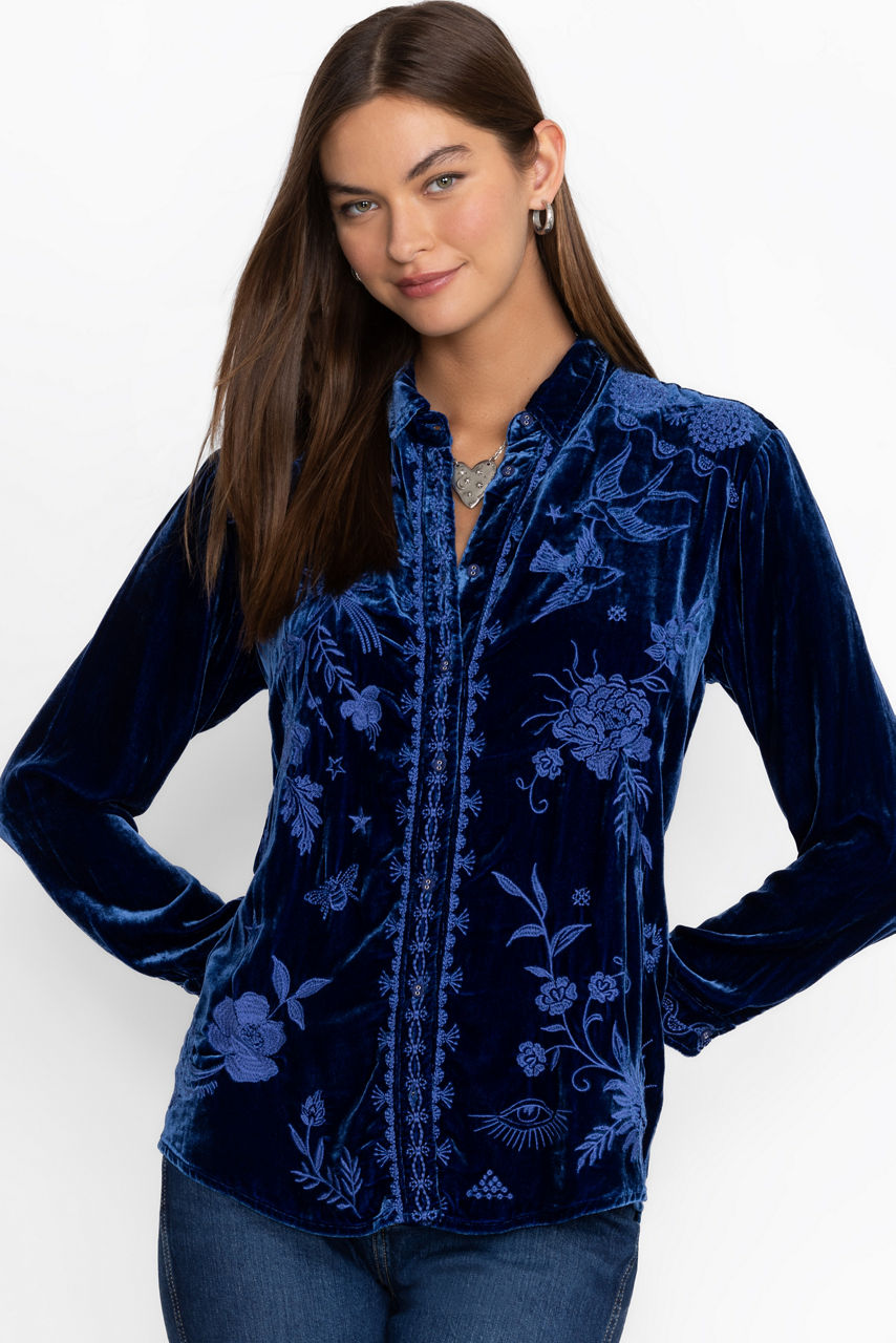 Crafted from a rich, silk-blend velvet, the Torine Velvet Oversized Shirt offers a feminine take on classic masculine shirting. Featuring a collared button-front and long sleeves, this oversized relaxed fit shirt is finished with intricate floral embroidery. Pair with fitted leggings and leather flats for a polished casual look.