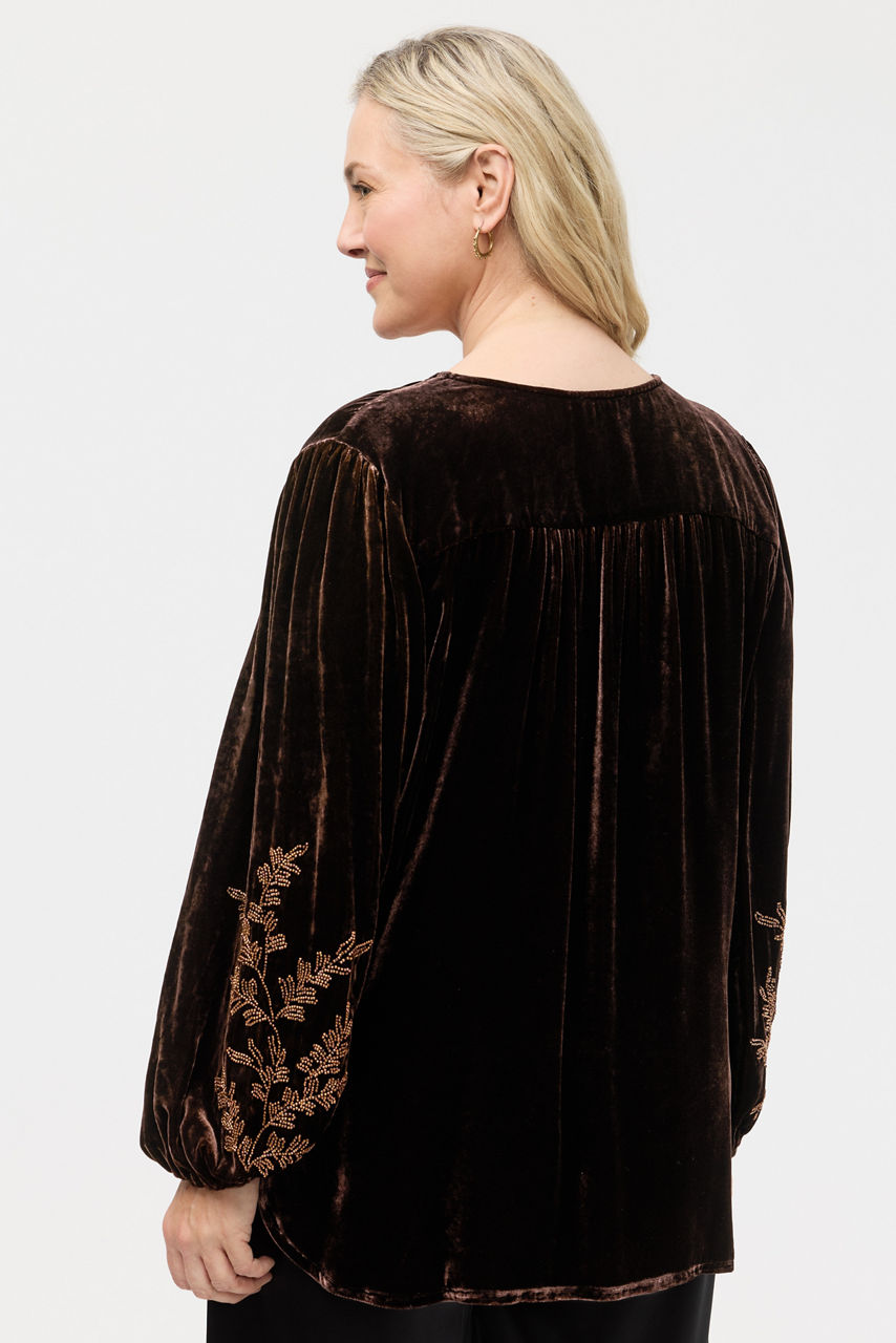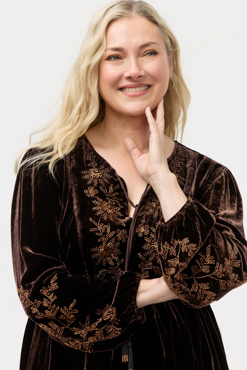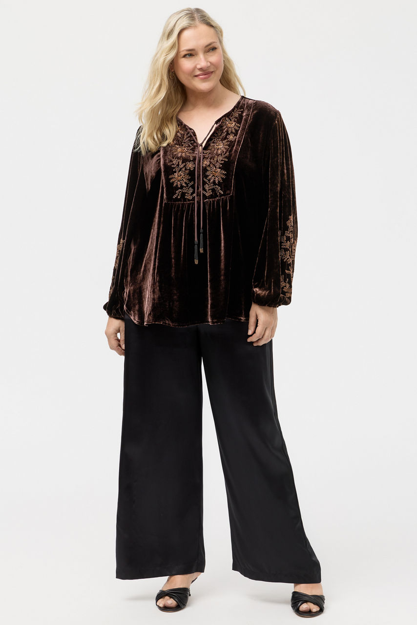 The Velvet Prairie Blouse is beautifully crafted from a unique silk blend. Featuring a split V-neckline with beaded tassels, this elegant top is finished with rich floral embroidered detailing at the neckline and sleeves. Pair with a pair of palazzo pants and kitten heels for a polished daytime ensemble.