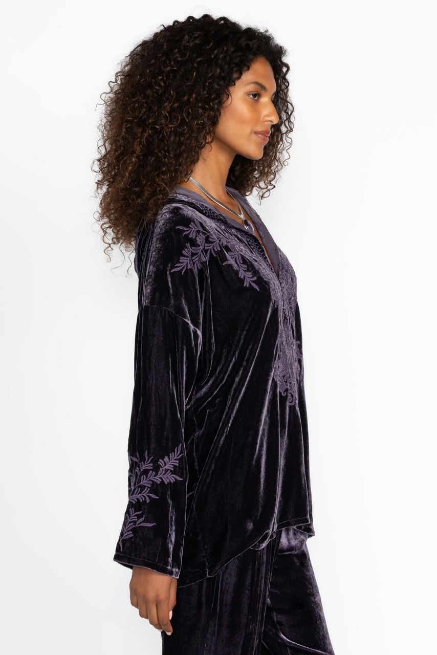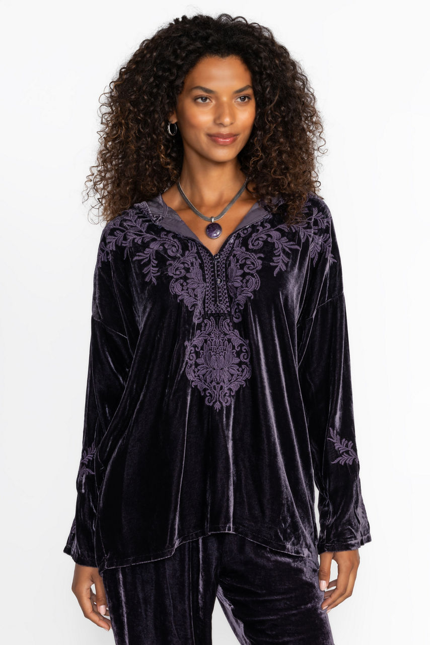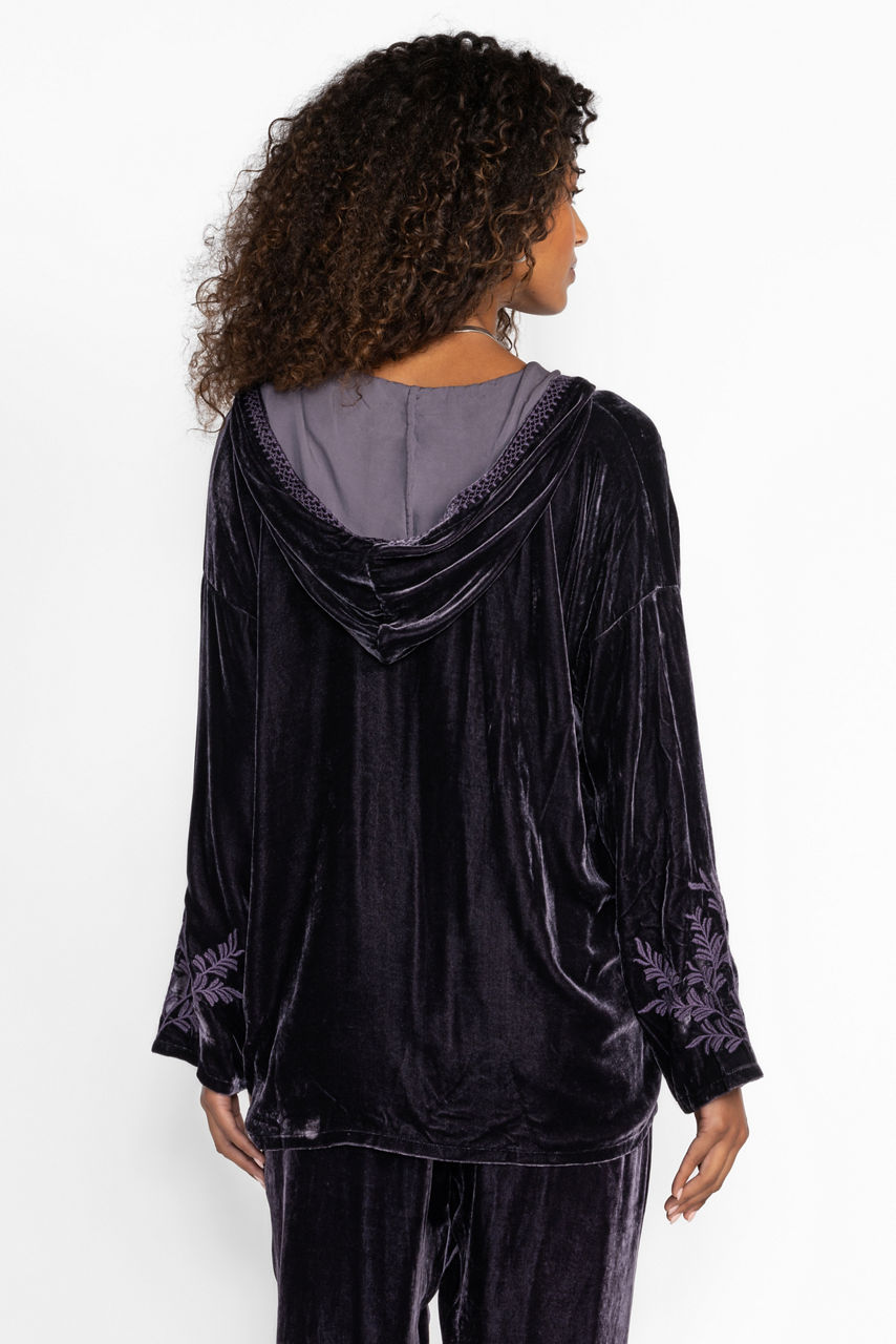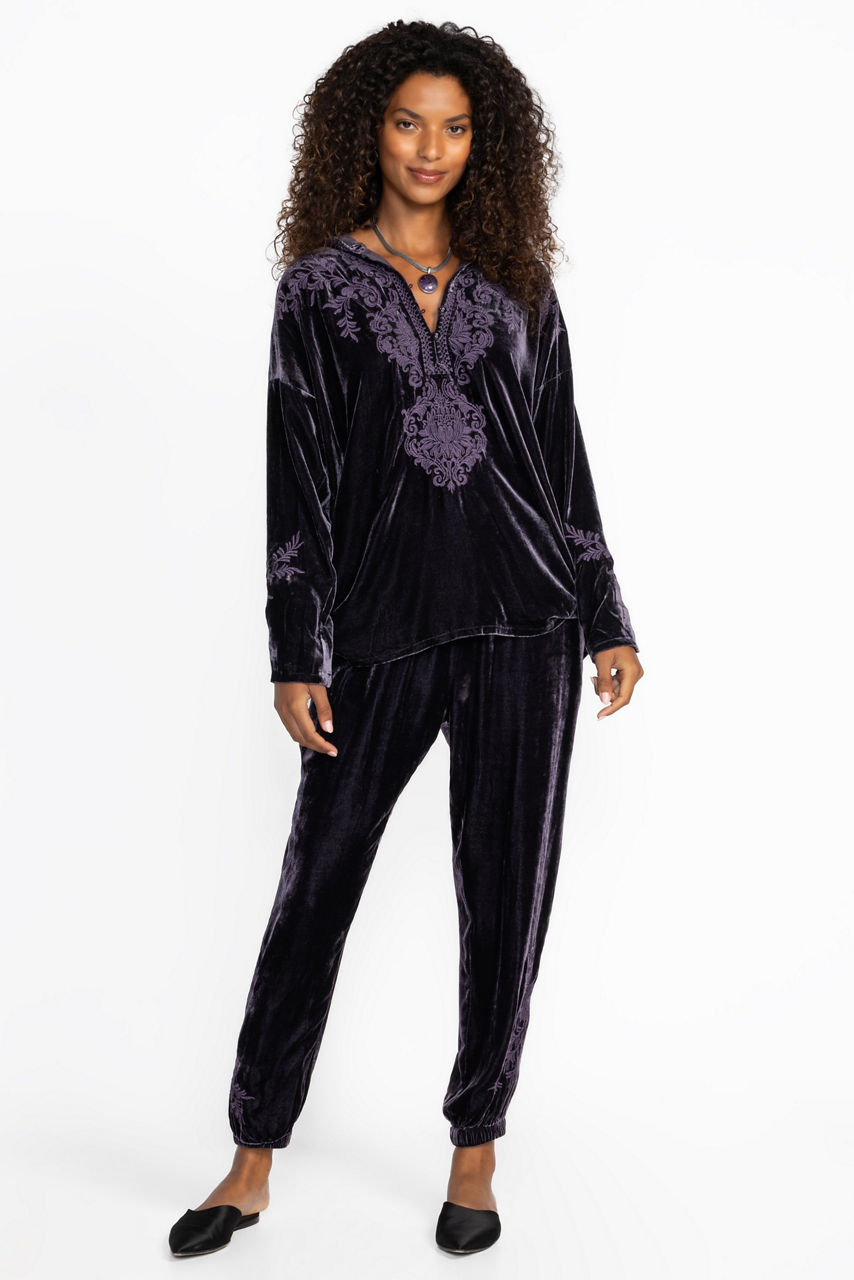 Crafted from a rich purple velvet, the Velvet Pull On Hoodie offers comfort and sophistication. Featuring an attached hood and a Henley neckline, this casual top is finished with ornate embroidered detailing throughout. Pair with the Velvet Joggers and sneakers for an elevated casual look.