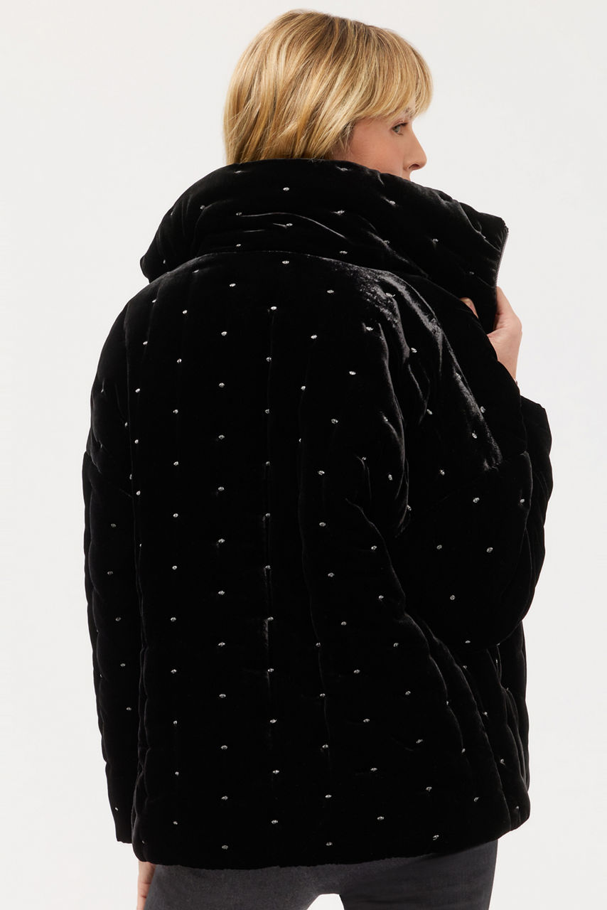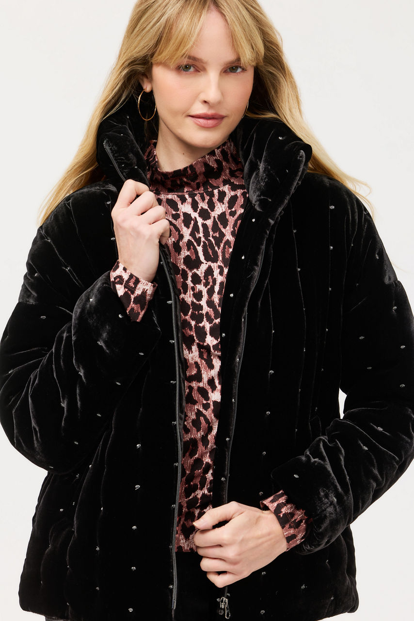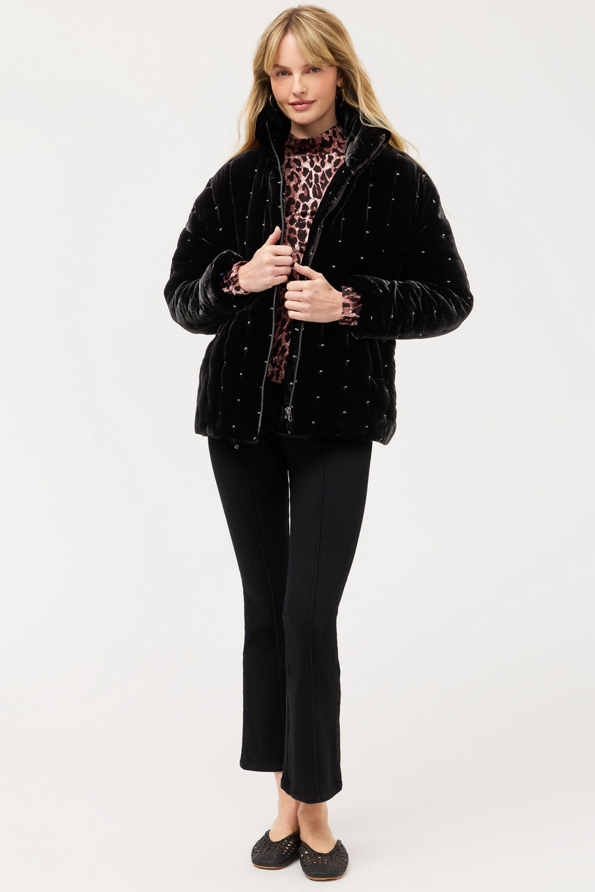 Crafted from a luxurious silk blend, the Velvet Quilted Puffer Jacket is accented with contrasting silver threads. Featuring a funnel collar and zippered front, this jacket is finished with slip pockets at the sides for convenience. Layer over a silk cami paired with a leather skirt for a girls' night out.