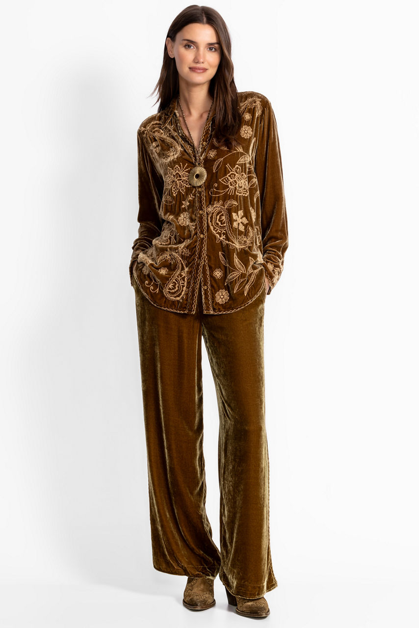 The Velvet Relaxed Seamed Shirt is crafted from a rich silk blend velvet in an eye-catching gold color. Featuring a classic collared button-front, this shirt is finished with intricate embroidered detailing and a curved hemline. Pair with the Isabelle Velvet pants for a perfectly coordinated weekend ensemble.