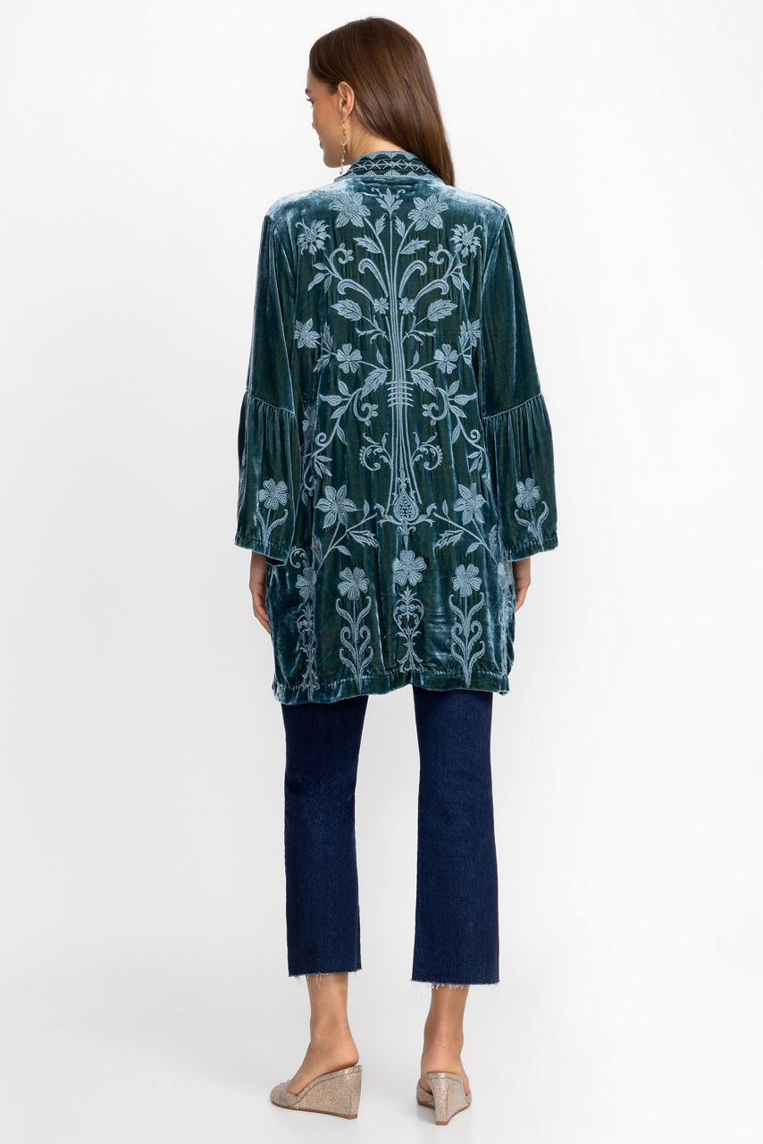Embellished with intricate tone-on-tone floral embroidery, the Talithia Velvet Ruffle Sleeve Kimono is the perfect combination of comfort and impeccable style. Crafted from a unique silk blend, this kimono features an open front with a contrasting border and ruffled sleeves. Layer over a black dress and pair with classic pumps for an evening look.
