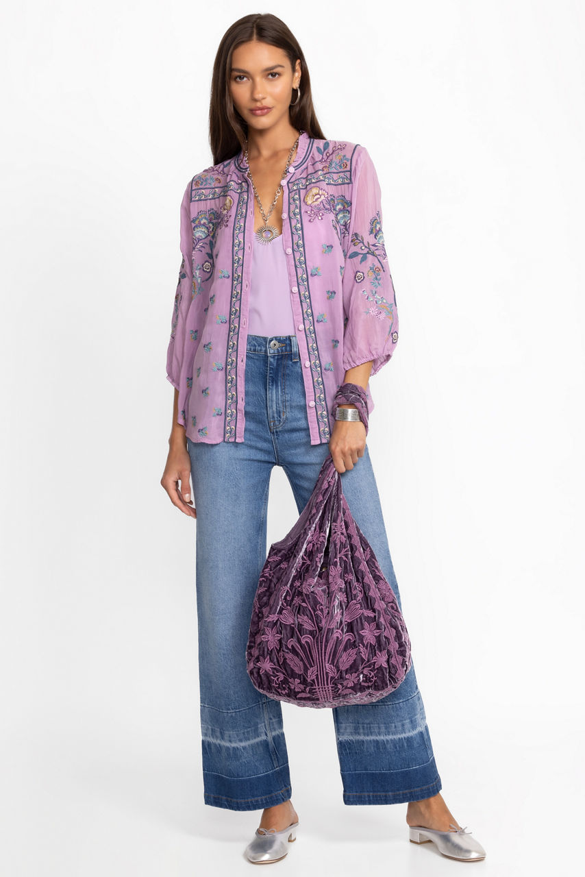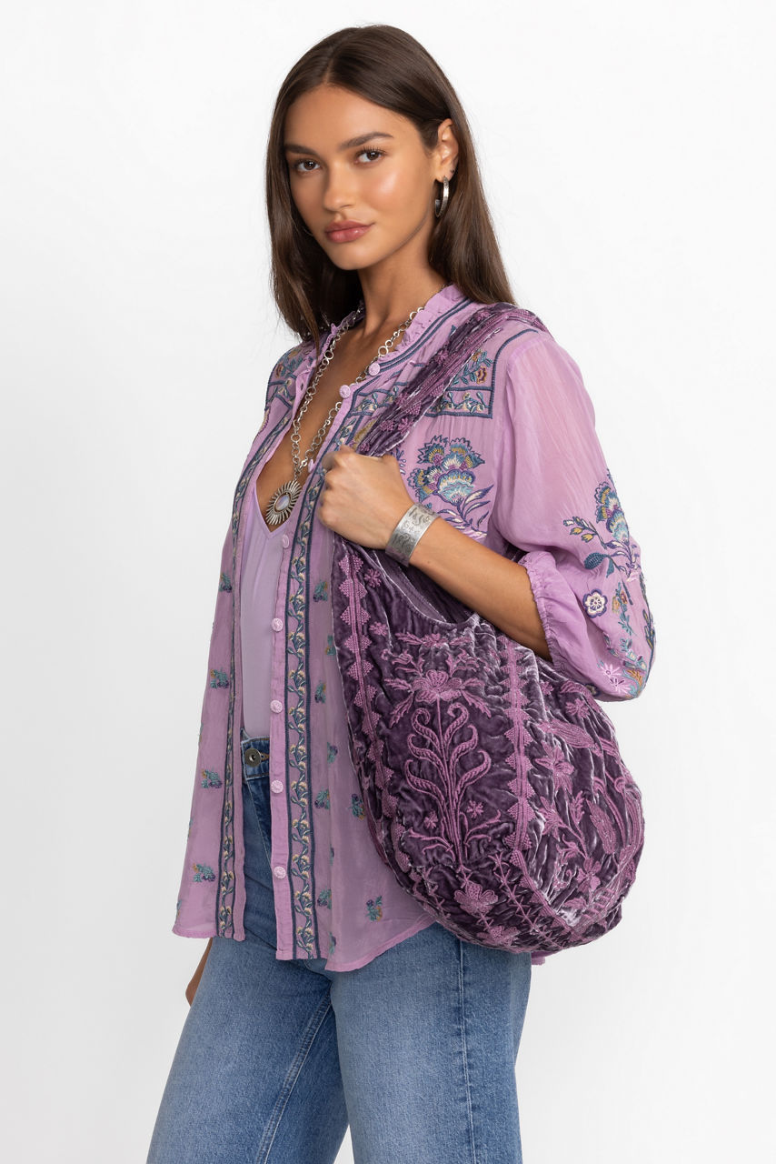 Thoughtfully crafted from a luxurious silk blend, the Talithia Velvet Slouchy Tote is embellished with intricate tone-on-tone floral embroidery in a rich peacock shade for a unique multi-dimensional look. Featuring a wide top opening and an interior slip pocket, this bag is finished with a metal snap closure at the top. Add to your daily look for a hint of drama and eclectic style.