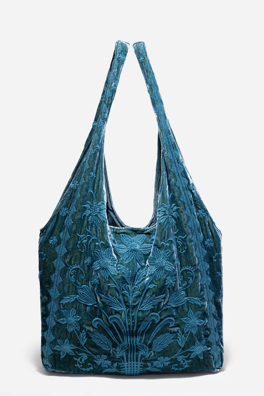 Thoughtfully crafted from a luxurious silk blend, the Talithia Velvet Slouchy Tote is embellished with intricate tone-on-tone floral embroidery in a rich peacock shade for a unique multi-dimensional look. Featuring a wide top opening and an interior slip pocket, this bag is finished with a metal snap closure at the top. Add to your daily look for a hint of drama and eclectic style.