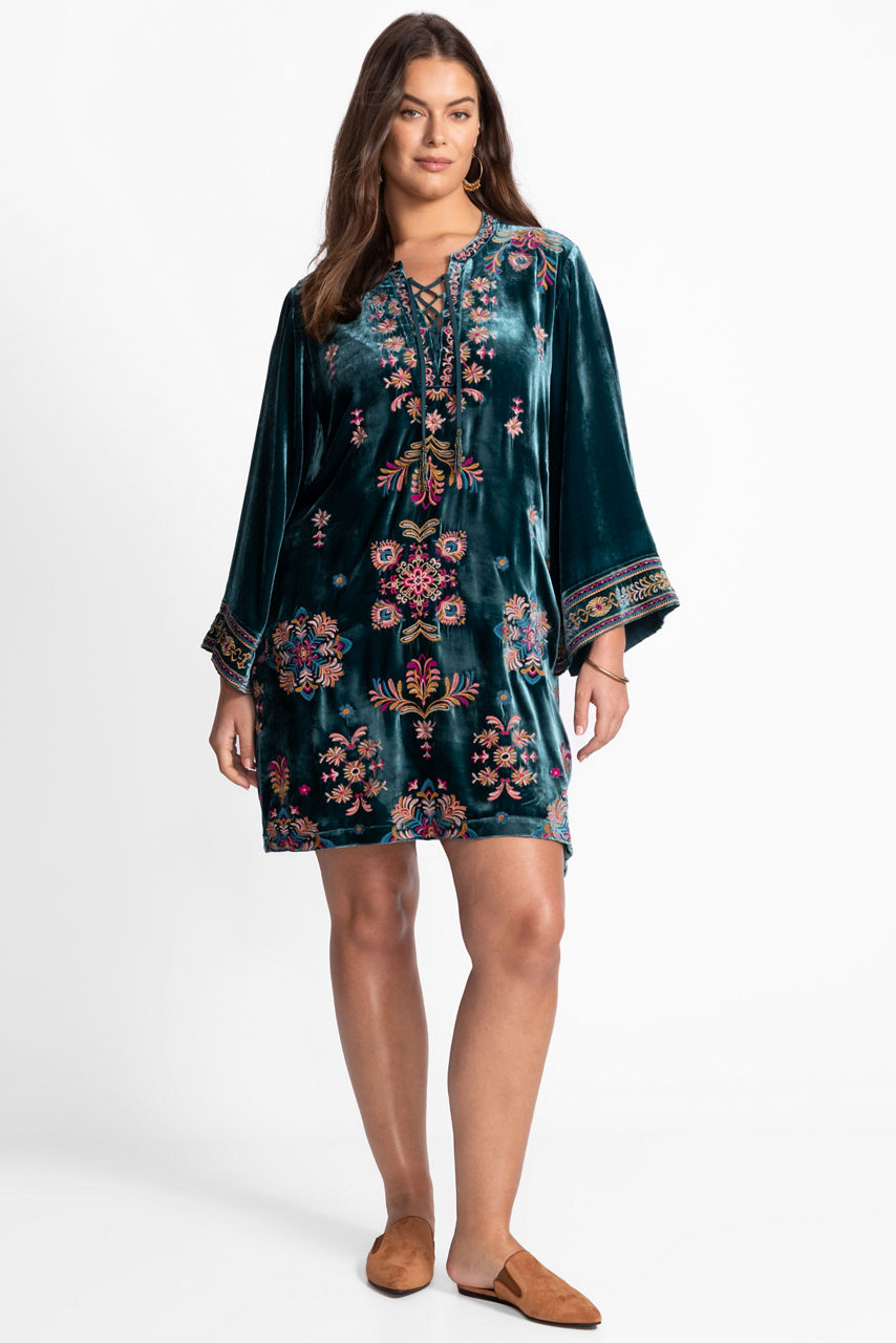 Crafted from a unique silk blend, the Brandi Velvet Tie Front Kimono Dress expertly blends comfort and elevated style. Designed with a split V-neckline with a beaded tassel tie, this dress is finished with wide kimono sleeves and intricate embroidered detailing in vibrant colors. Pair with wedge heels and bold jewelry for a resort-inspired ensemble.