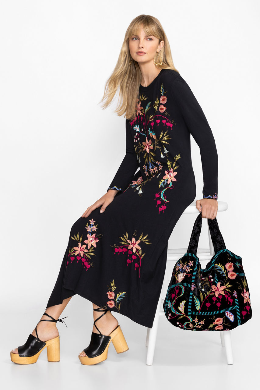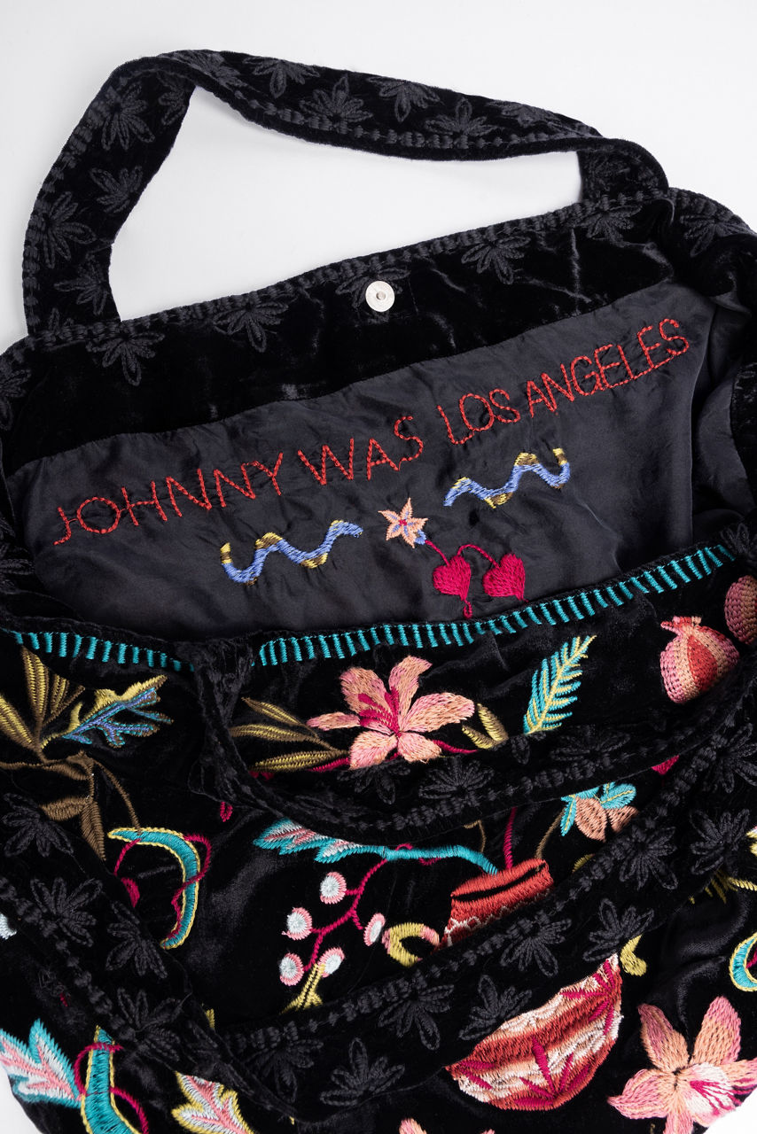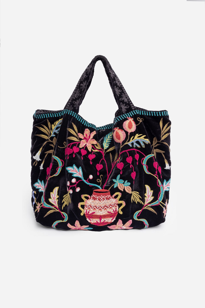 Crafted from a luxurious silk blend, the Amarylla Velvet Tote Bag is emblazoned with intricate floral embroidered detailing. Featuring a top handle and a shoulder strap, this vibrant bag offers an interior pocket and a magnetic snap top closure. Add to a denim-on-denim look for a splash of vibrant color.