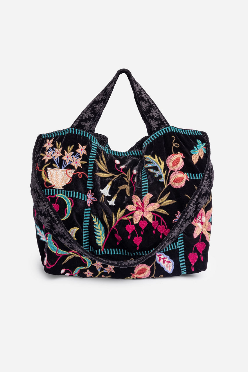 Crafted from a luxurious silk blend, the Amarylla Velvet Tote Bag is emblazoned with intricate floral embroidered detailing. Featuring a top handle and a shoulder strap, this vibrant bag offers an interior pocket and a magnetic snap top closure. Add to a denim-on-denim look for a splash of vibrant color.
