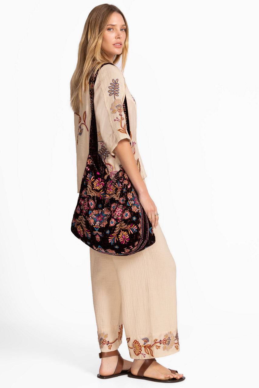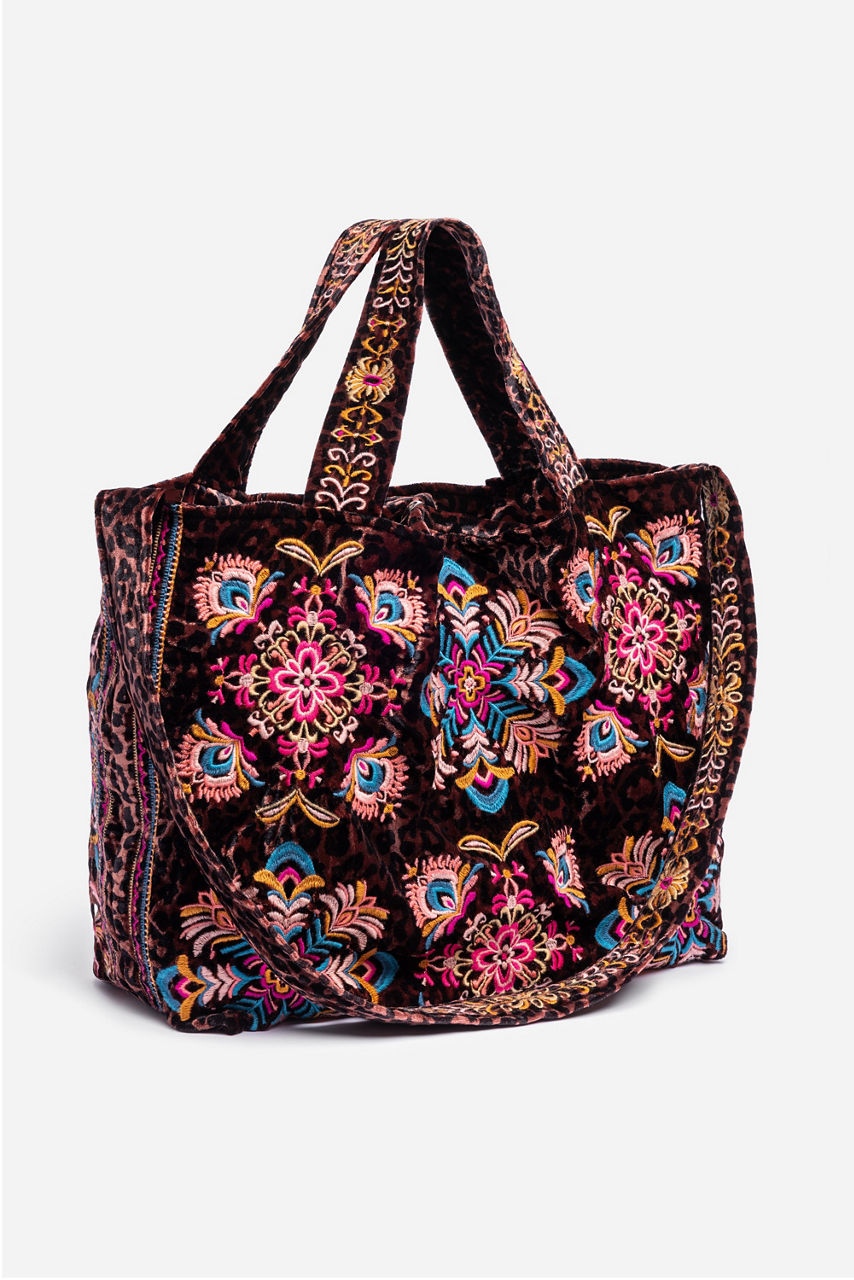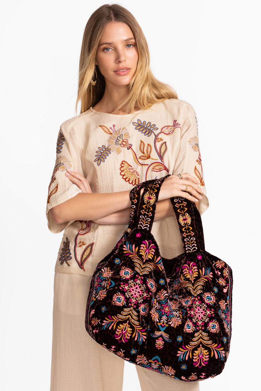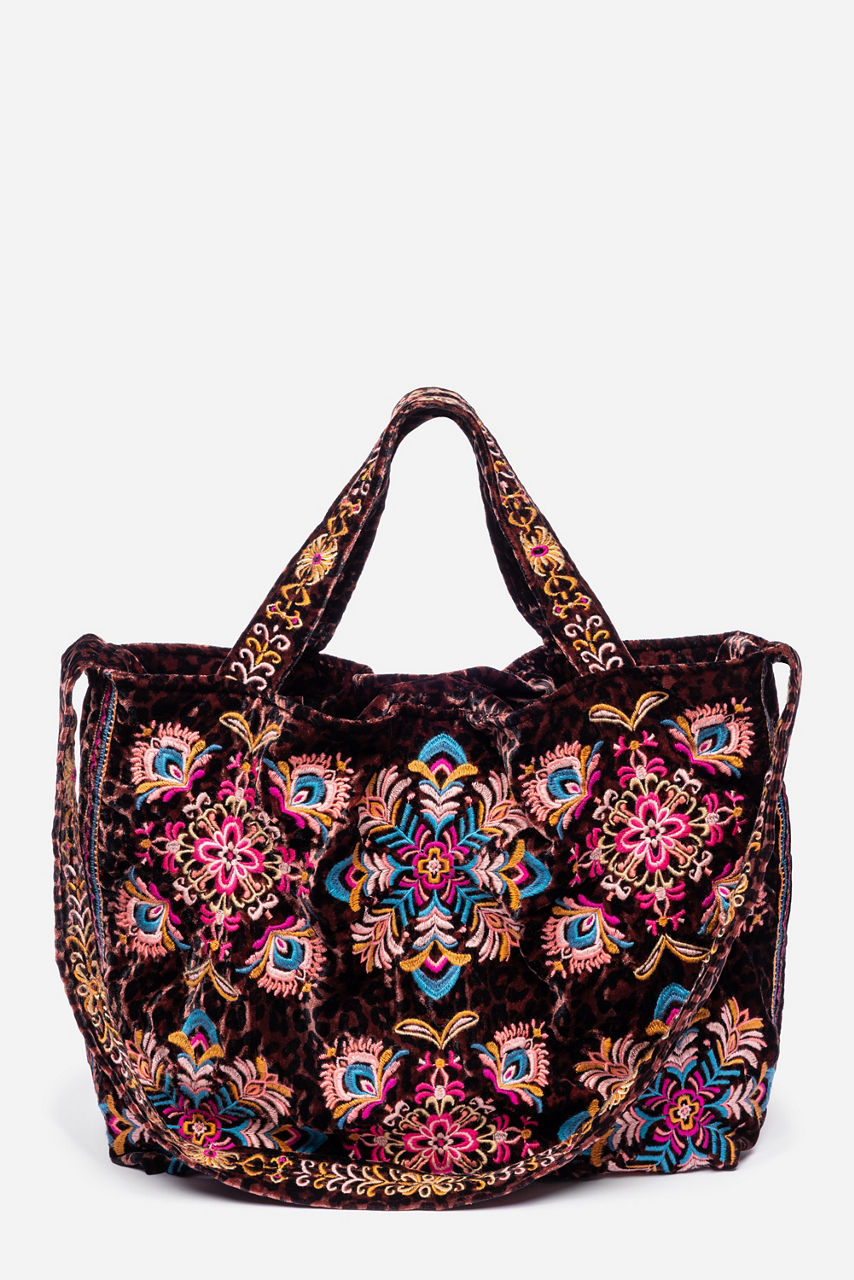 Adorned with a vibrant kaleidoscope of color, the Brandi Velvet Tote Bag is embellished with intricate embroidered accents for a bold, textured look. Designed with both handles and a shoulder strap for versatility, this unique bag is finished with a magnetic snap and interior pockets. Pair with casual looks as an everyday bag with elevated style.