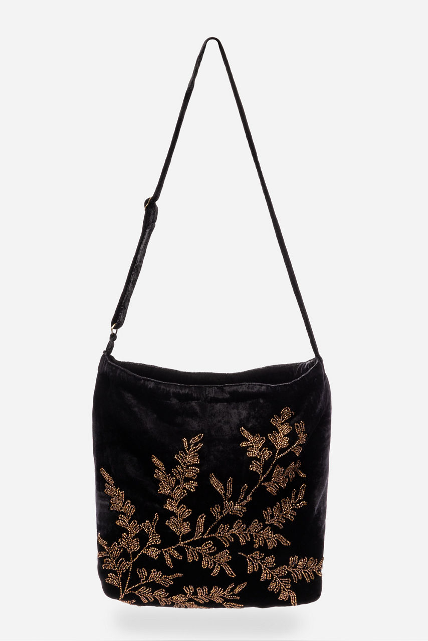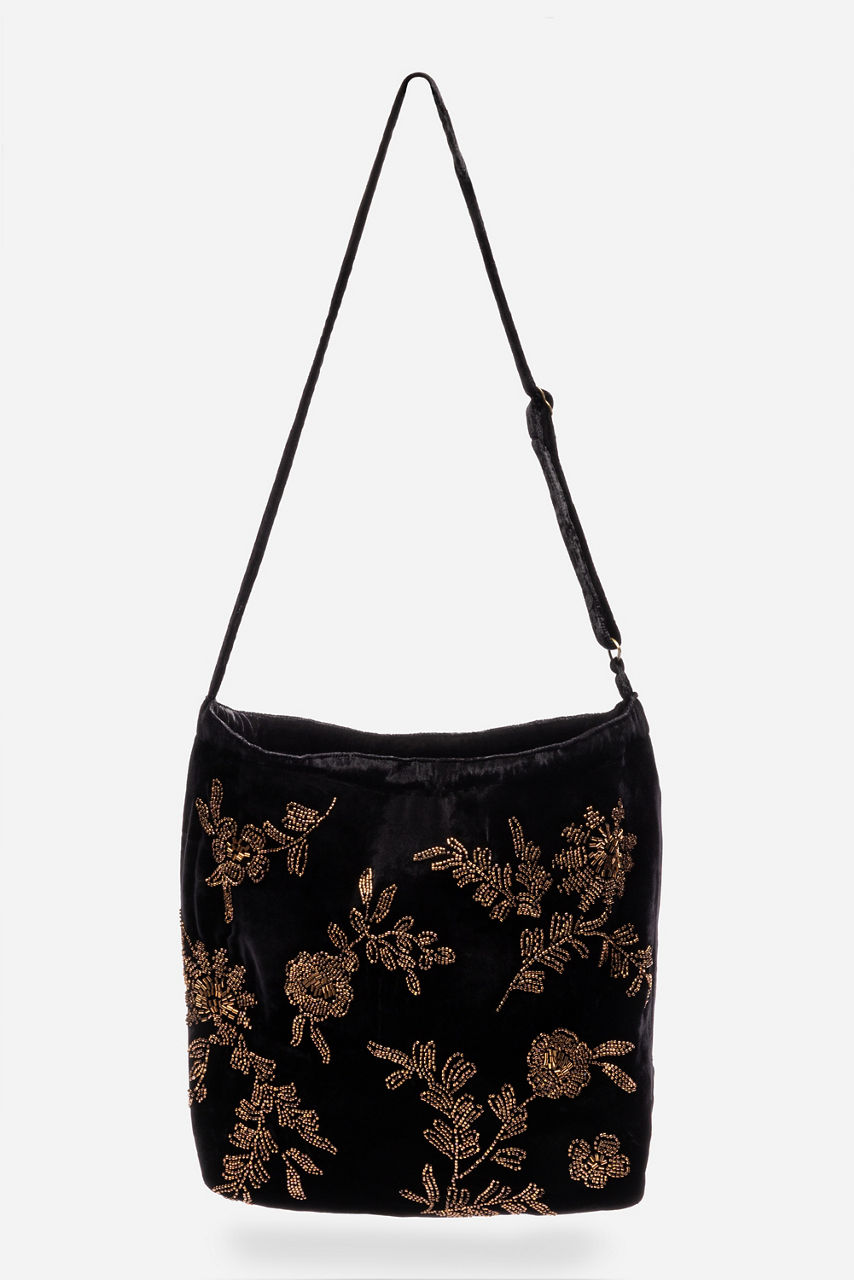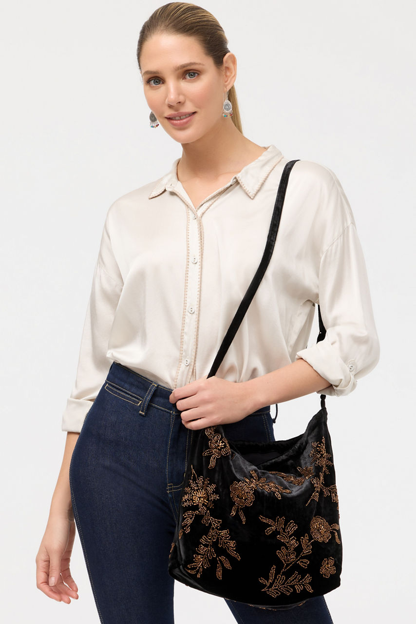 Crafted from a soft silk blend, the Velvet Tote Bag is embellished with glass beadwork and intricate embroidery. Designed with a drawstring closure and an interior zippered pocket, this beautifully made bag is finished with an adjustable shoulder strap. Pair with a cozy pullover and trousers for dinner with friends.
