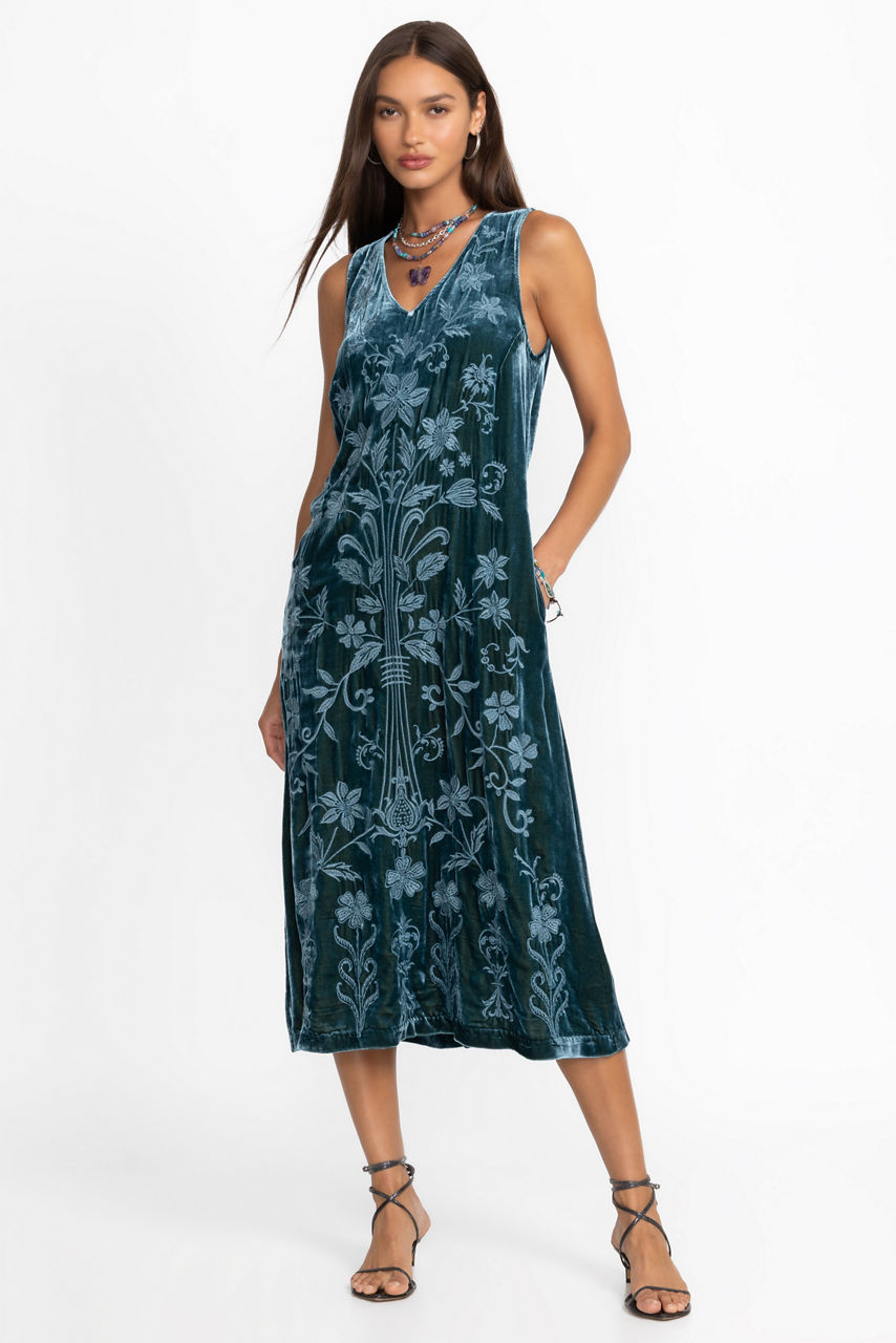 Crafted from a unique silk blend fabric, the Talithia Velvet V-neck Dress features intricate tone-on-tone embroidered detailing against a vibrant peacock hued backdrop. Featuring a V-neck front with a keyhole detail at the back, this A-line dress is finished with a flowing skirt. Pair with kitten heels and a classic clutch for a polished night-out ensemble.