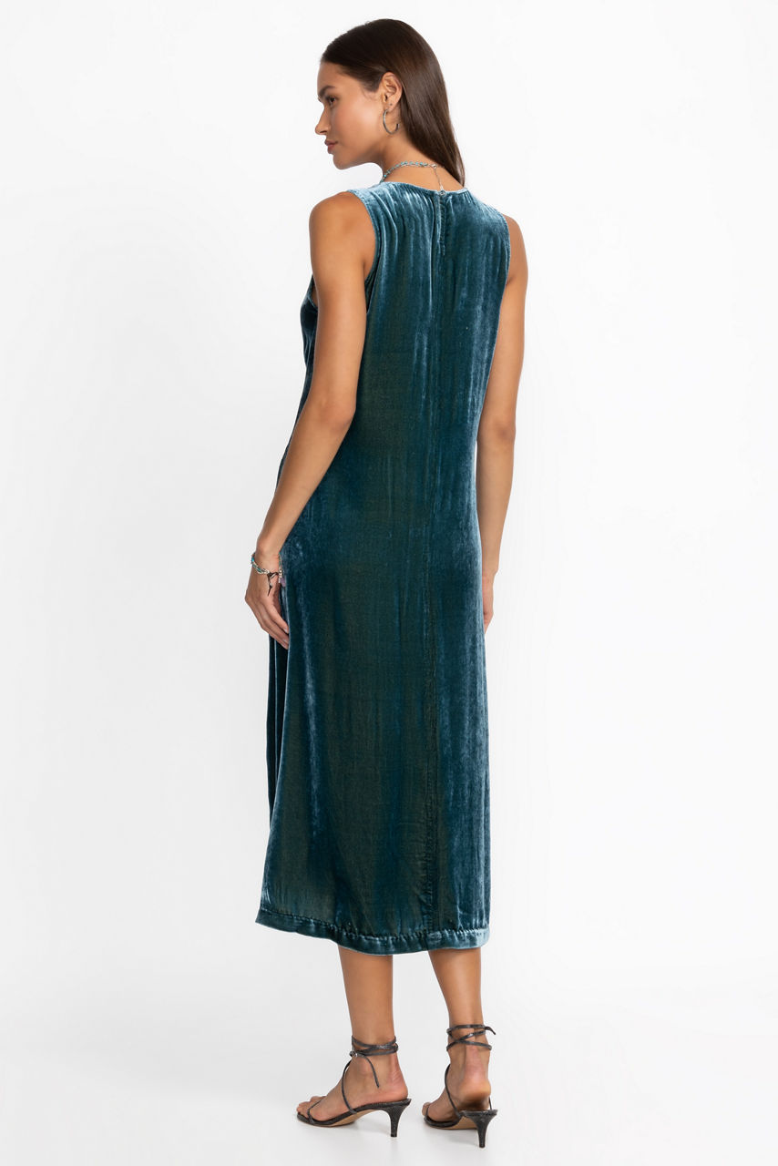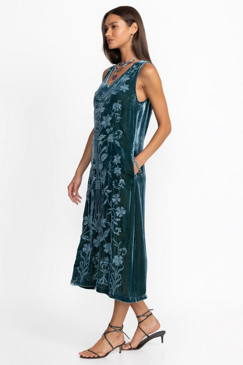 Crafted from a unique silk blend fabric, the Talithia Velvet V-neck Dress features intricate tone-on-tone embroidered detailing against a vibrant peacock hued backdrop. Featuring a V-neck front with a keyhole detail at the back, this A-line dress is finished with a flowing skirt. Pair with kitten heels and a classic clutch for a polished night-out ensemble.