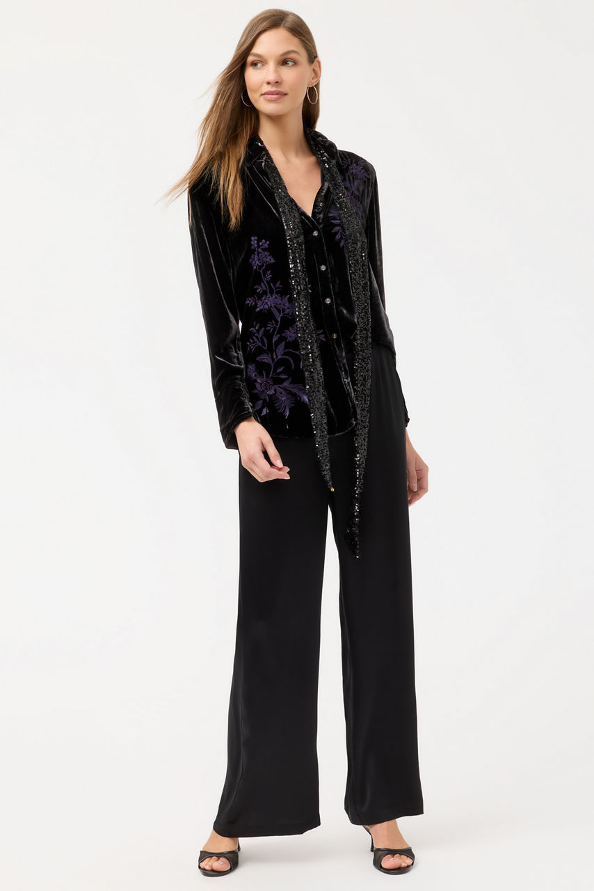 Beautifully embellished with intricate embroidered detailing at the front and back, the Velvet Vintage Button Down Shirt is crafted from a rich silk blend. Designed with a classic collared button-front and long sleeves, this elegant top is finished with a gently curved hemline. Pair with coordinating trousers and flats for an elevated casual event.