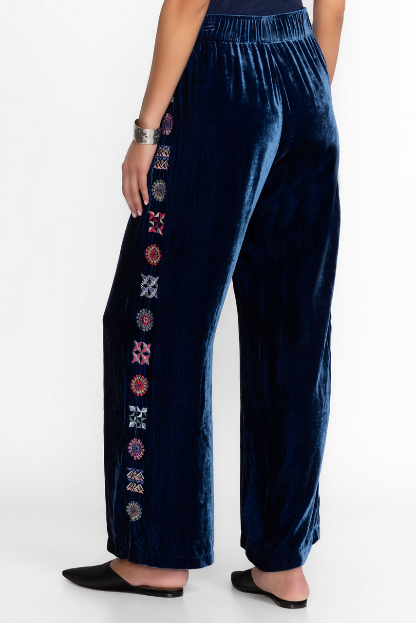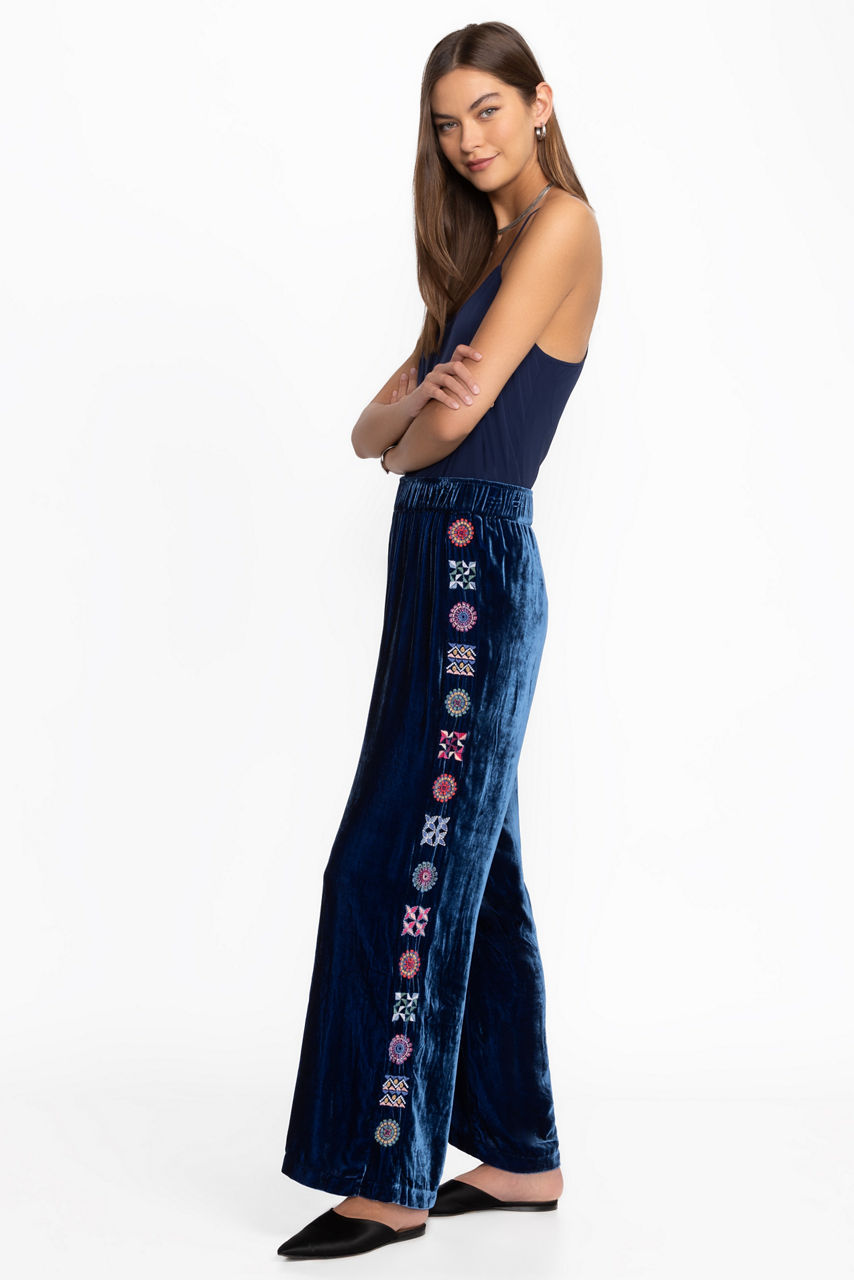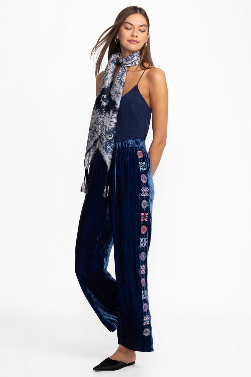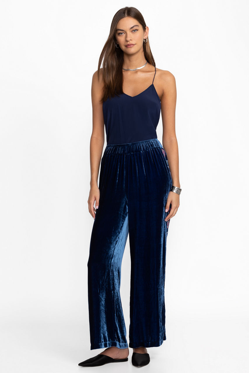 Crafted from a rich, silk-blend velvet, the Velvet Wide Leg Pants combine comfort with stylish flair. Featuring an elastic waistband and a wide-leg silhouette, these luxurious pants are finished with colorful detailing in a tuxedo stripe down the leg line. Pair with a coordinating tank and slides for a polished casual look.