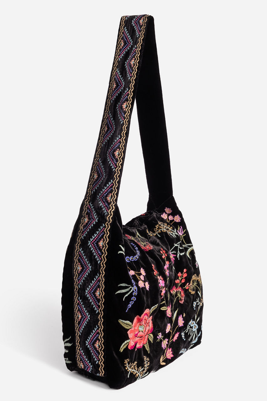 Adorned with bold, floral embroidered detailing, the Velvet Wide Strap Tote Bag is crafted from a rich silk blend velvet. Designed with a single contrasting wide shoulder strap, this spacious bag features an interior zip pocket and offers a magnetic snap closure. Pair with a silk blouse and classic denim for a bold textured look.