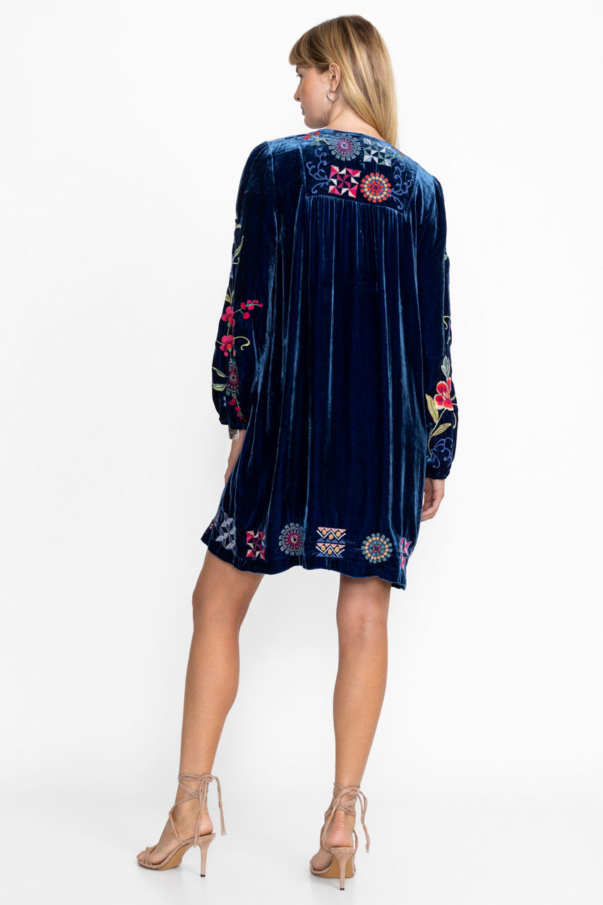 Crafted from a luxurious silk-blend velvet, the Nikkola Velvet Yoke Dress is embellished with bold splashes of color. Featuring a split V-neckline and gently puffed sleeves, this relaxed-fit dress is finished with bold embroidered detailing throughout. Pair with flats and boho chic jewelry for an elevated casual look.