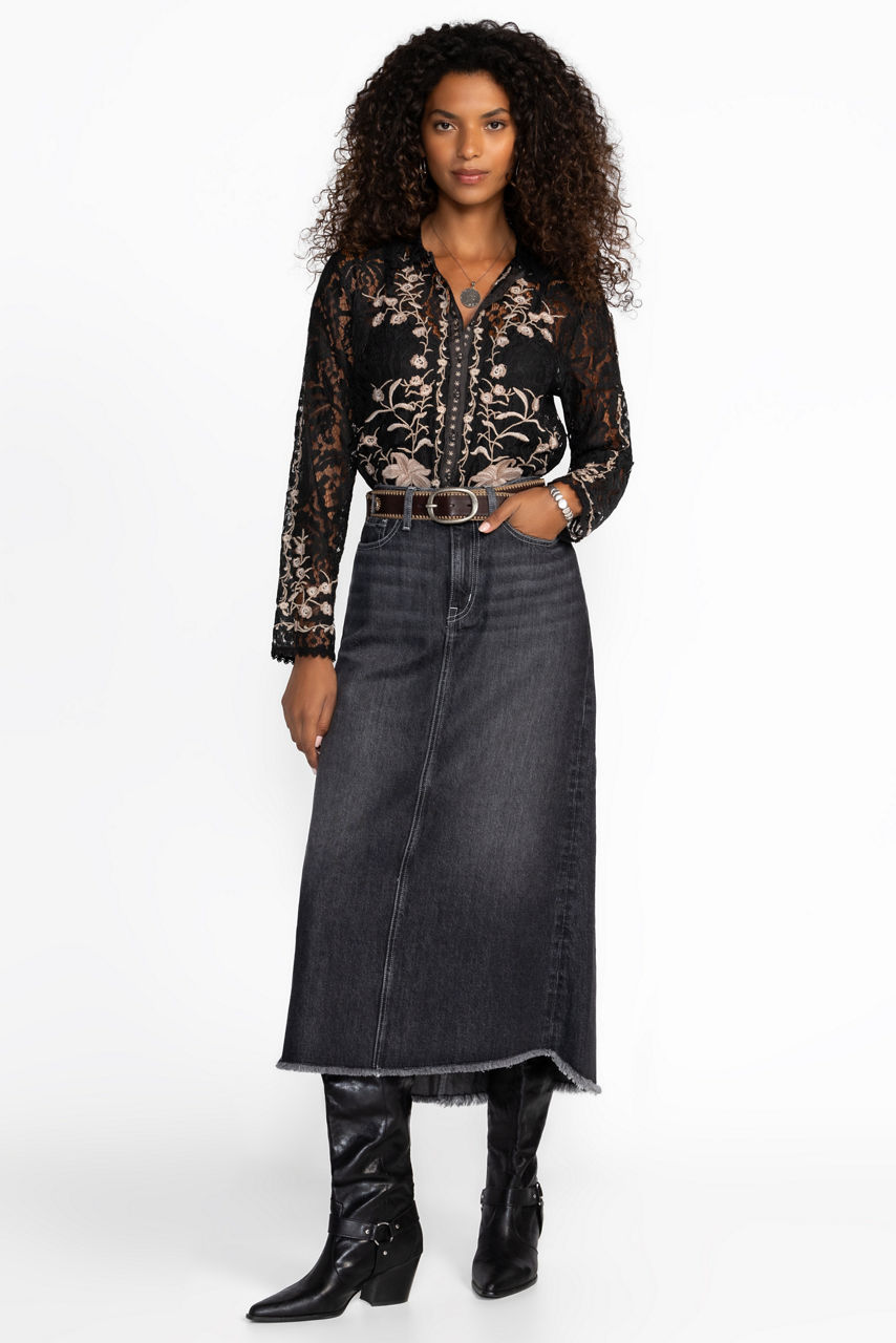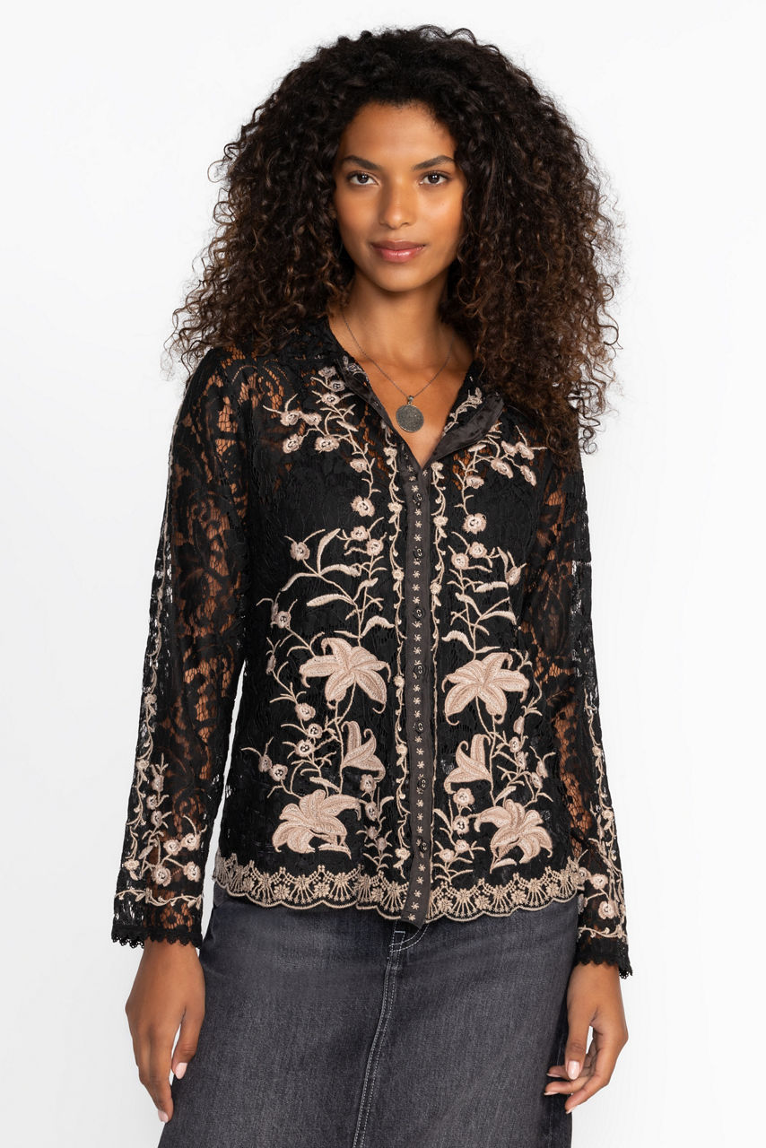 Exquisitely detailed, the Manaos Veronne Lace Blouse offers the perfect blend of elegance and sophistication. Crafted with an intricately detailed lace shell, this slip-lined, button-front blouse is finished with scalloped hem sleeves and ornate placement embroidery for an opulent look. Pair with sleek pants and heels for a truly classic evening look.