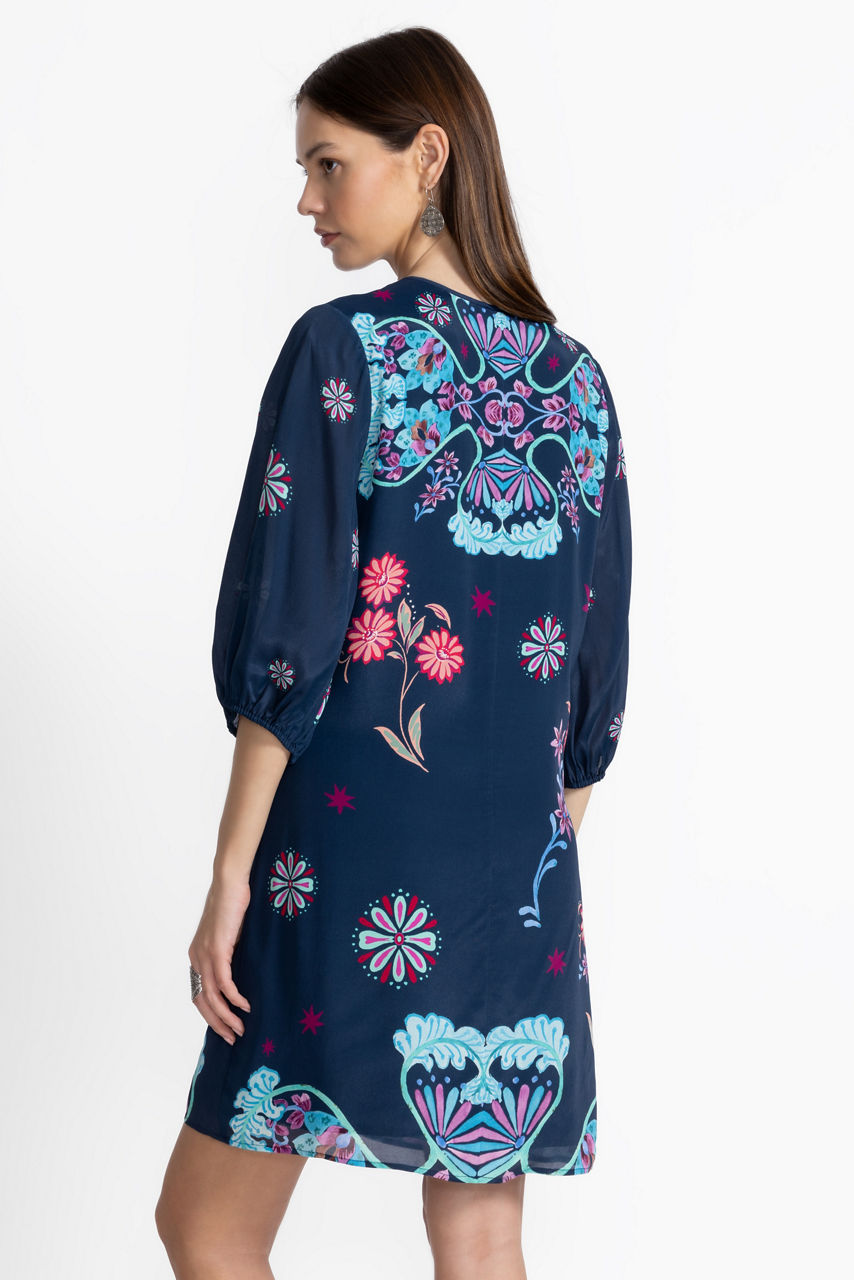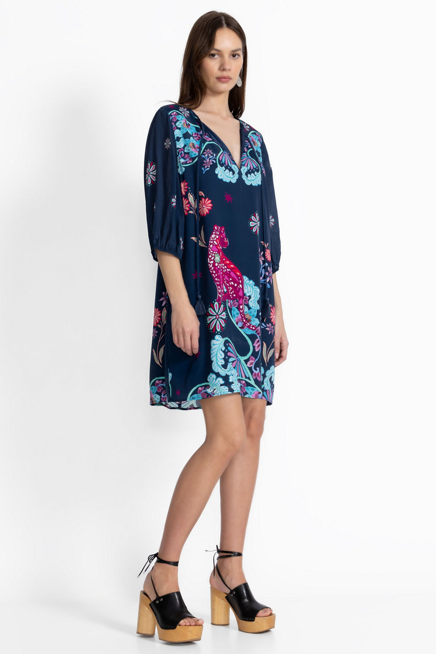 Crafted from a flowing silk blend, the Leilana Vesna Mini Dress is adorned with a bold design washed in vibrant color. Featuring a keyhole front with decorative tassels on the tie, this mini-dress offers gathers at the sleeves and shoulders and is finished with a straight silhouette. Pair with kitten heels and a coordinating clutch for a posh daytime event.