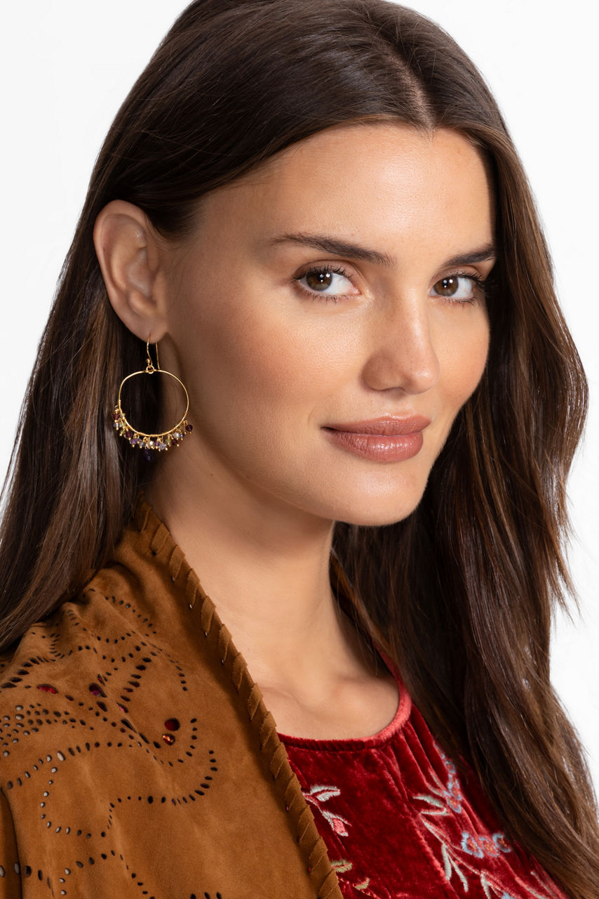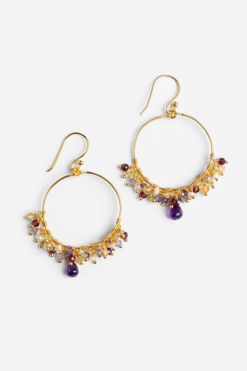 Make a bold entrance with the Vibrant Chandelier Amethyst Earrings, a radiant mix of color and texture. These hoops feature an artful cascade of amethyst, citrine, iolite, peridot, and cultured freshwater pearls. Each pair is a celebration of rich hues and elegant sparkle, perfect for day-to-night brilliance.