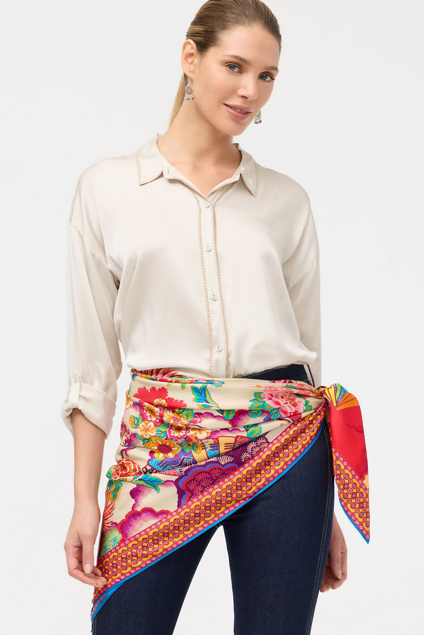 Crafted from 100% luxurious silk, the Vicky Silk Twill Scarf is a rich colorful accessory. Featuring a vibrant floral motif including a variety of blooms, this scarf is bordered with bold color enhanced with eye-catching pattern. Wear over your hair tied at the neck for windy days to maintain a perfect coiffed style.