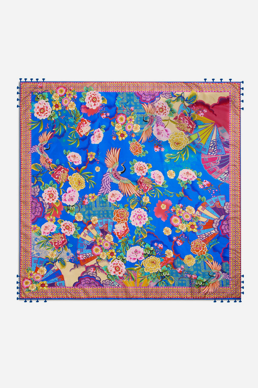 Crafted from 100% luxurious silk, the Victoria Silk Scarf is a rich colorful accessory. Featuring a vibrant floral motif including a variety of blooms, this scarf is bordered with bold color enhanced with an eye-catching pattern and tassels at the corners. Wear over your hair tied at the neck for windy days to maintain a perfect coiffed style.