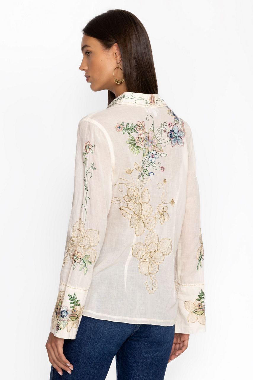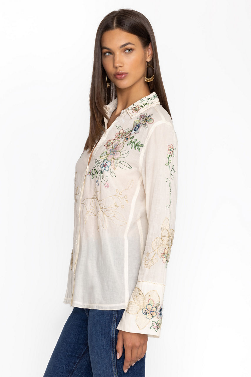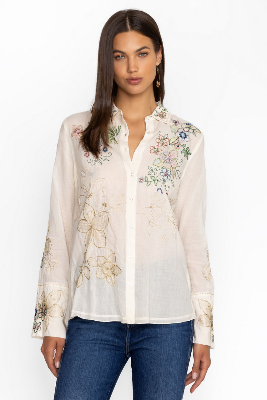 Offering a blend of classic style and modern comfort, the Abby Vintage Button Down is a must-have piece. Crafted from 100% cotton, this top features delicate embroidery and a button-down design that adds a refined touch to your everyday look. Perfect for layering or wearing on its own, it's a versatile addition to any wardrobe.