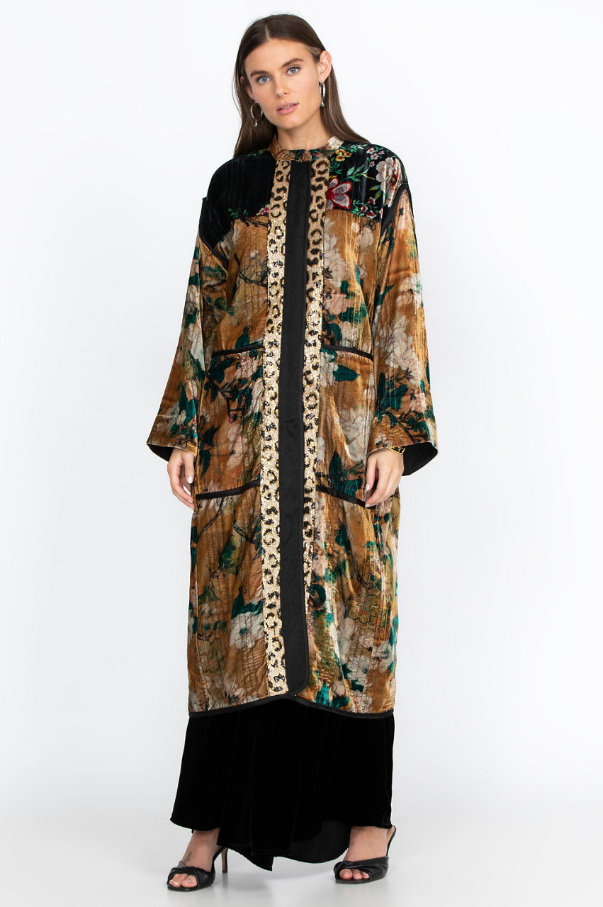 This elegant coat features a smooth silk blend and a chic motif that will elevate your outerwear collection. The contrasting colors create a structured effect while the floral patterns and color blocks result in a modern feel. Warm and comfortable, the Vintage Lotus Velvet Coat is also a versatile piece. Dress it down with some denim and chunky sneakers or wear it with a blouse and dress pants for a chic look.