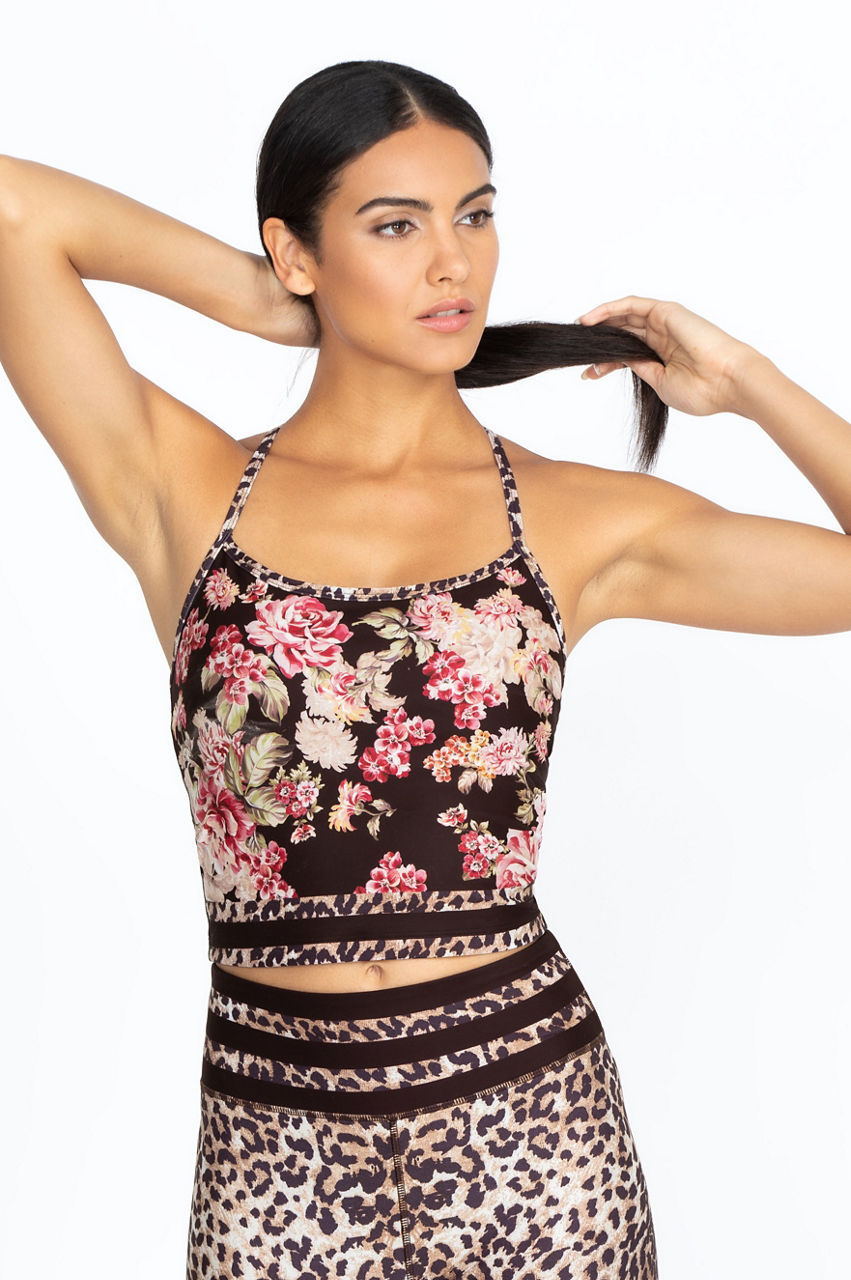Our Vintage Rose Bee active cami features a delicate floral pattern on a mocha brown background. Leopard-print edging encircles the top edges and forms flattering racerback straps. Wear this top for your next workout with our Vintage Rose Bee active high waist legging for a striking exercise ensemble.