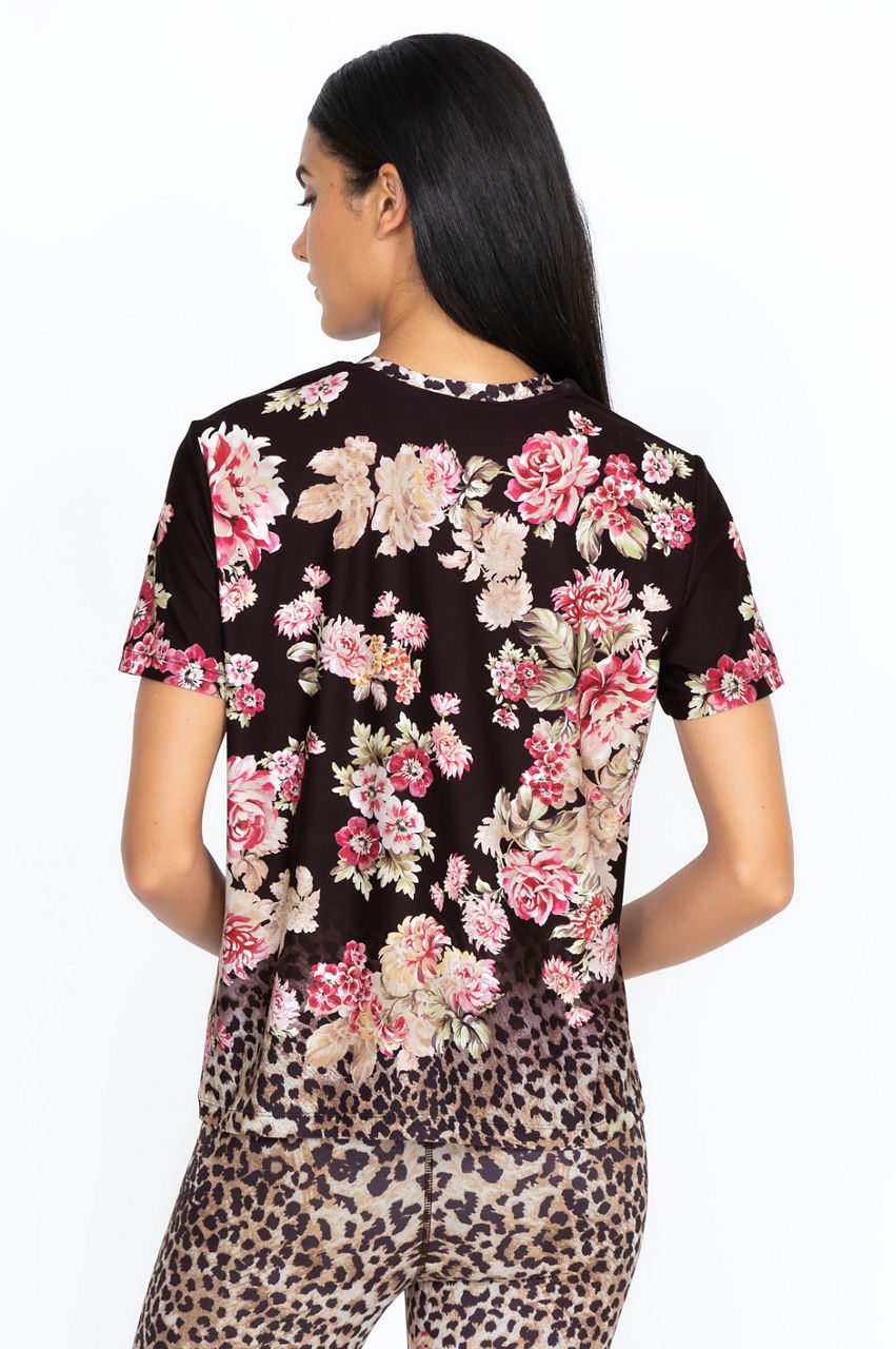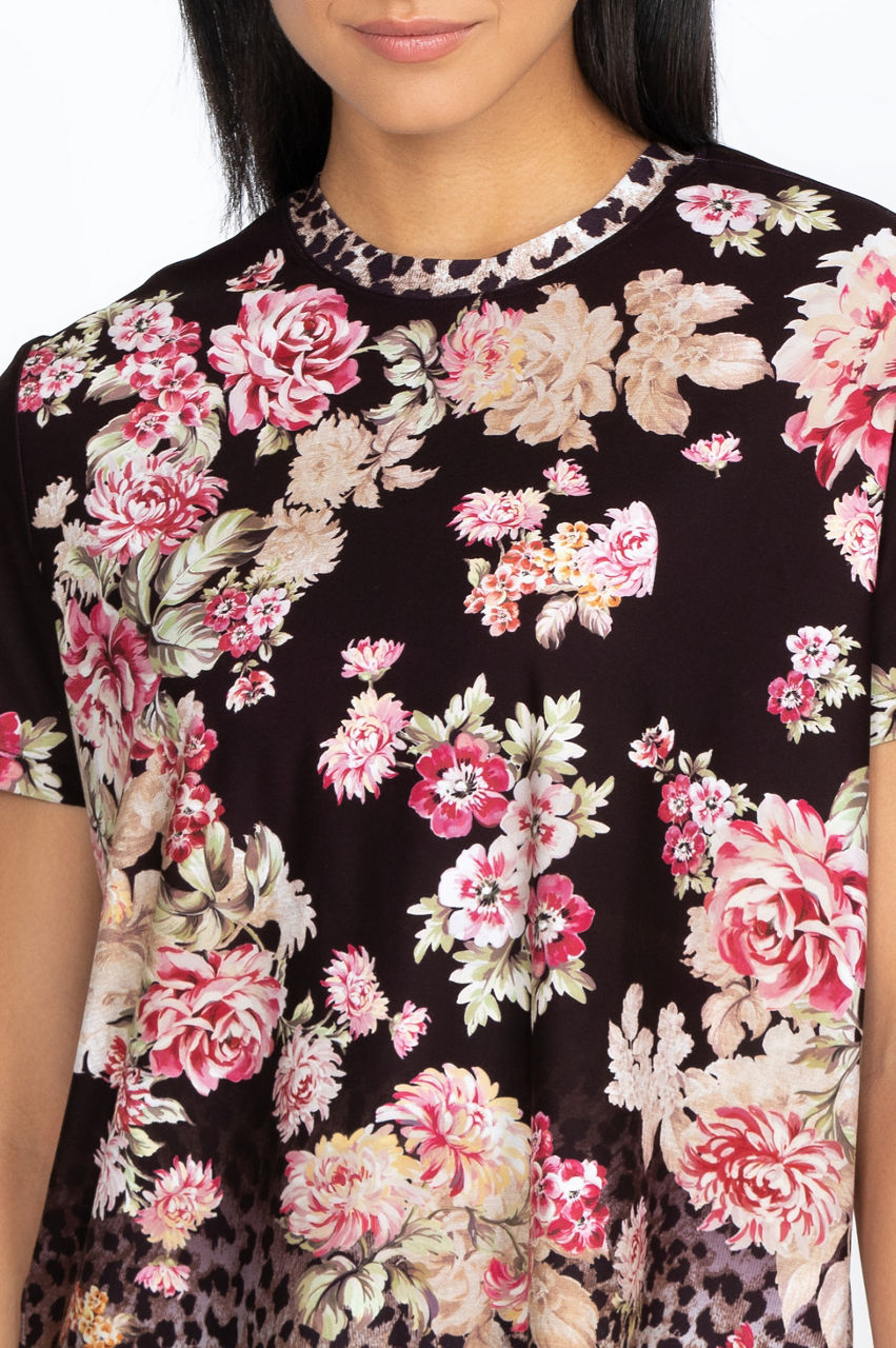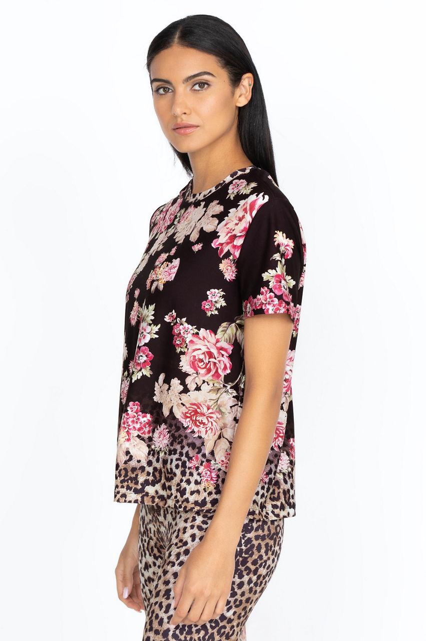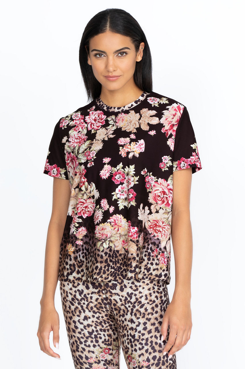 A black background provides the perfect setting for the muted rose garden gracing our Vintage Rose crew neck tee. The flowers fade to a soft leopard pattern a few inches above the hem. Small roses on a black backdrop finish the neckline with a classic hem. This versatile short-sleeved tee could be paired with a light, pale pink jacket for cooler evenings.