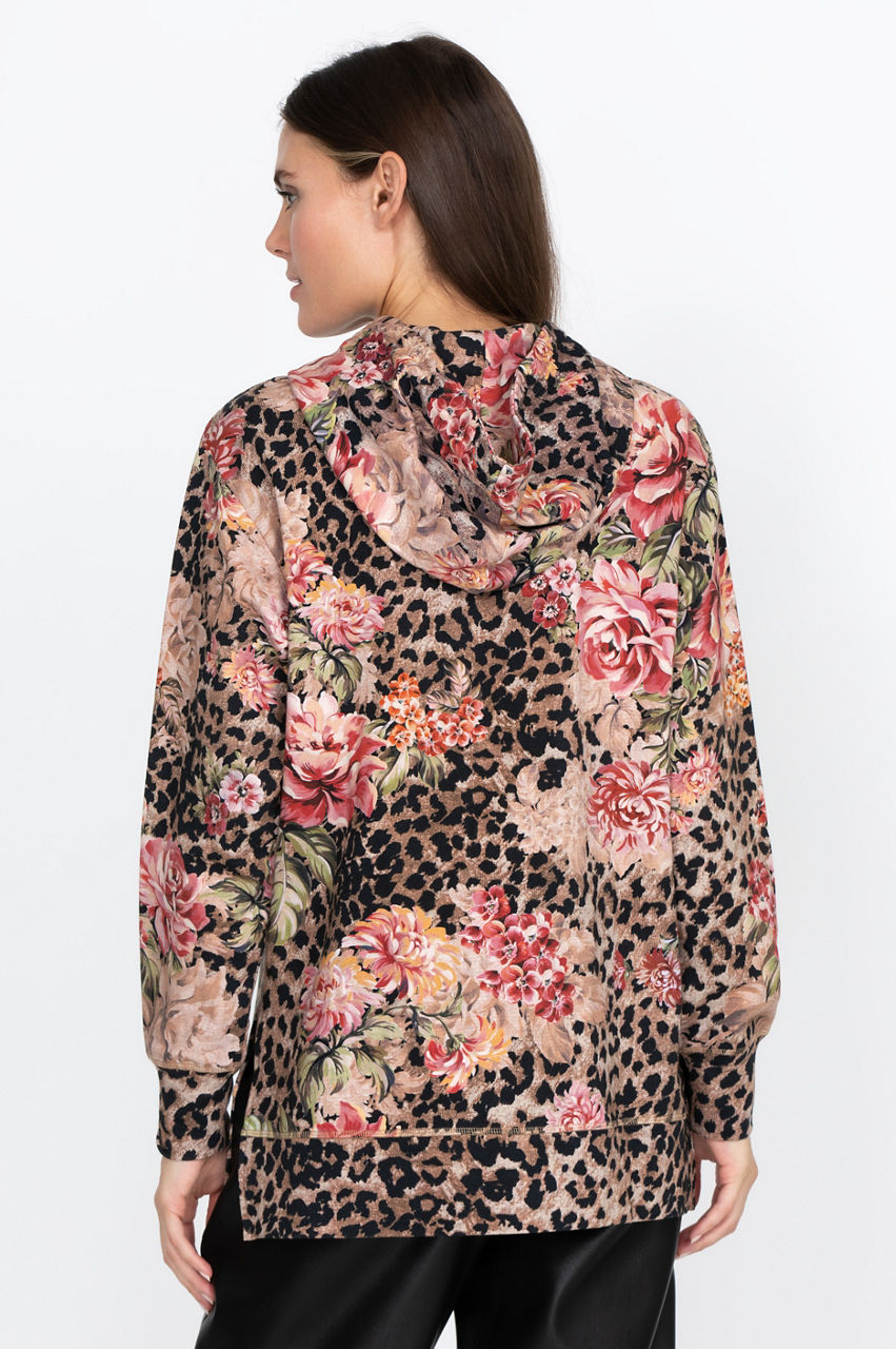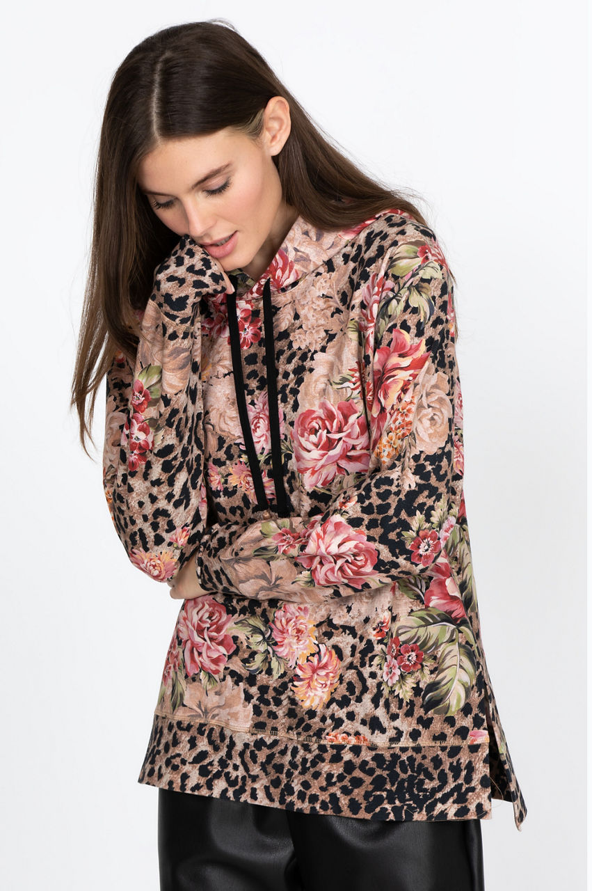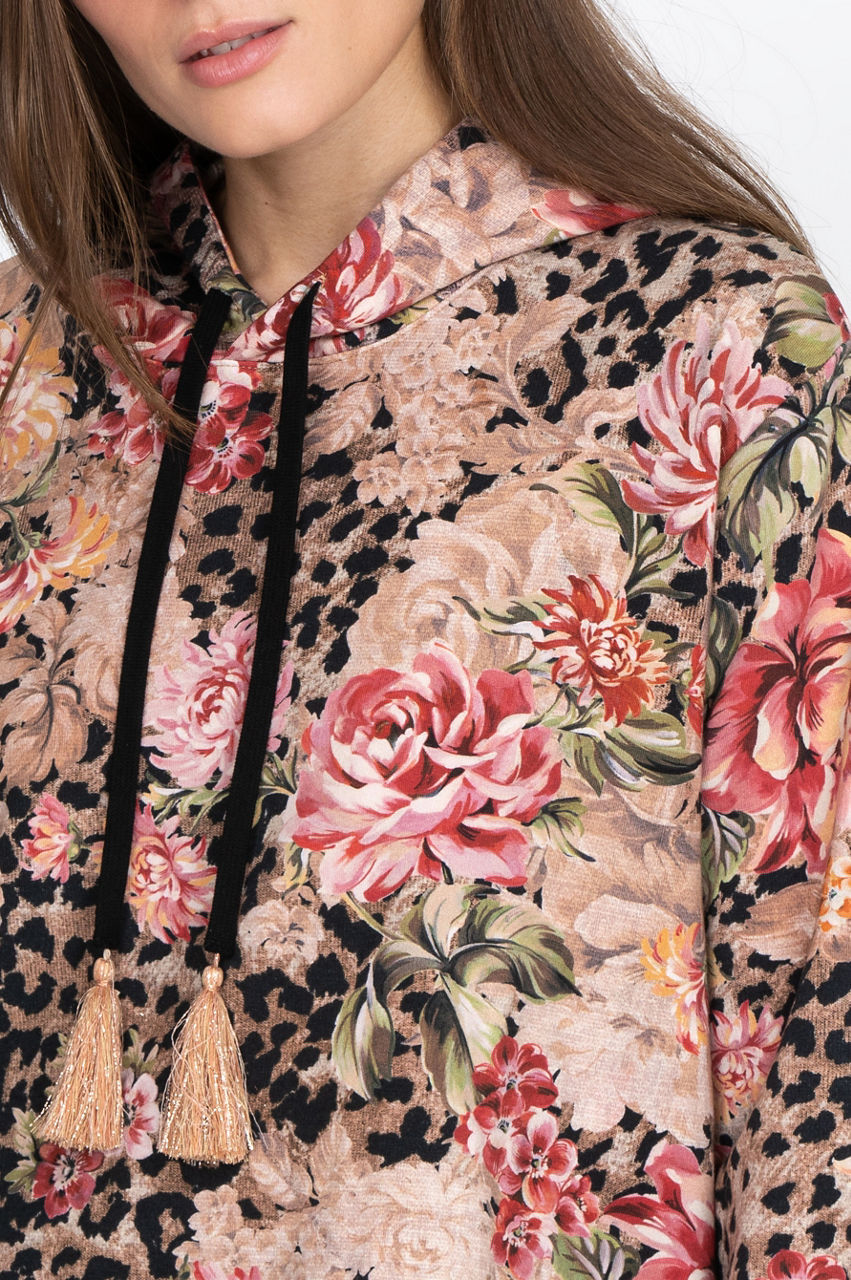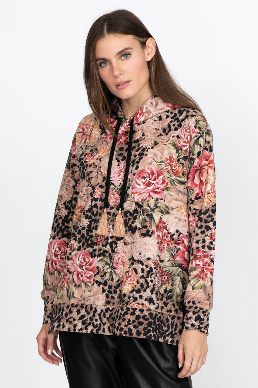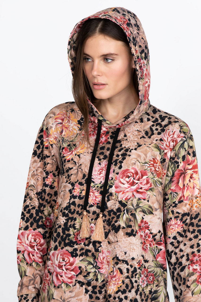 Take your basics to the next level with this elegant crew neck sweatshirt. The delicate print uses a mix of floral and animal-inspired elements to play with colors while the timeless high-low cut results in a unique piece. Wear this stylish and comfortable top with some leggings and white sneakers for a chic and active look.