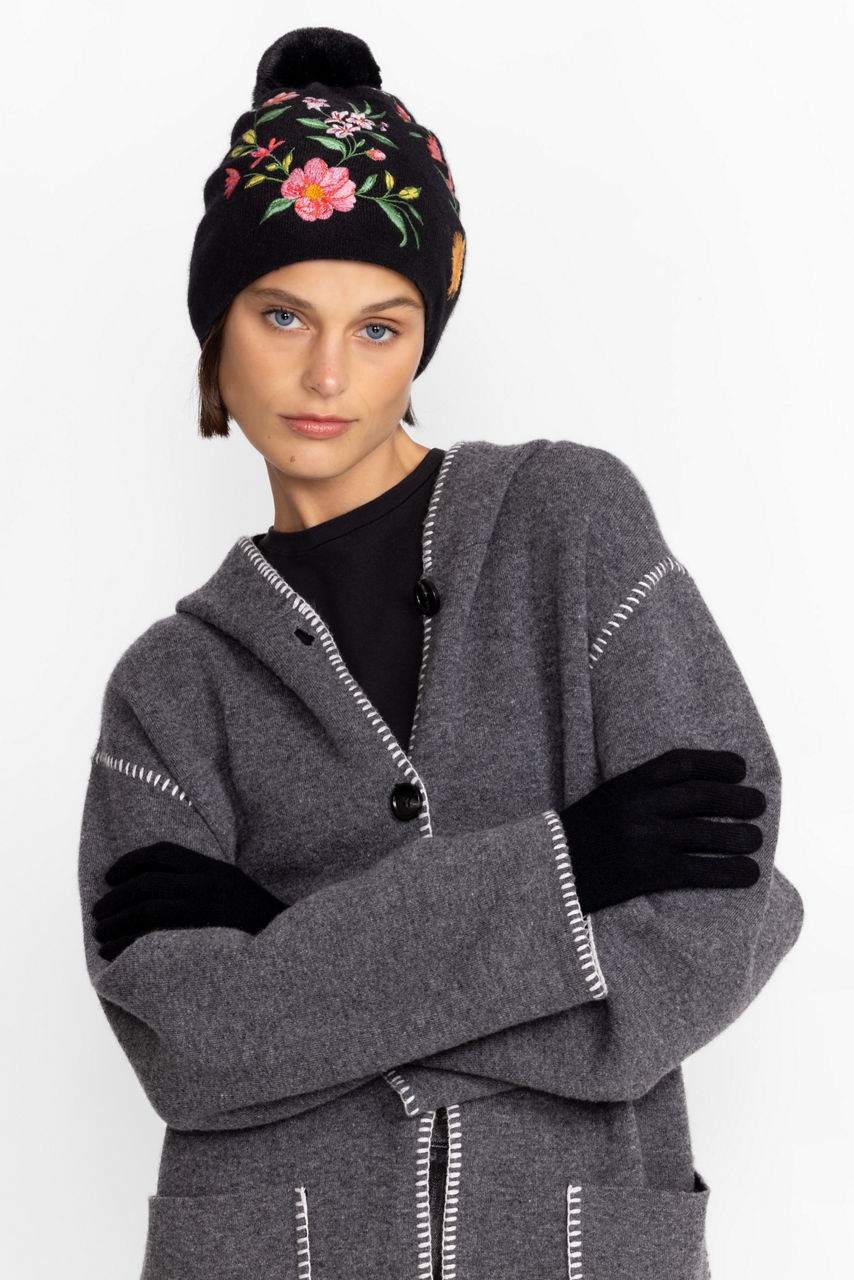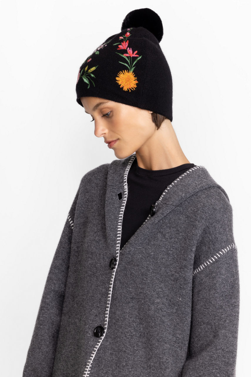 Spun from a soft wool cashmere blend, the Vista Beanie calls to mind images of a beautiful floral garden. A stylish pick for colder days, this beanie is characterized by a pompom embellishment and vibrant embroidered flowers. Wear this beanie with a simple cozy knit, a puffer jacket, and jeans on your next frosty weekend walk.