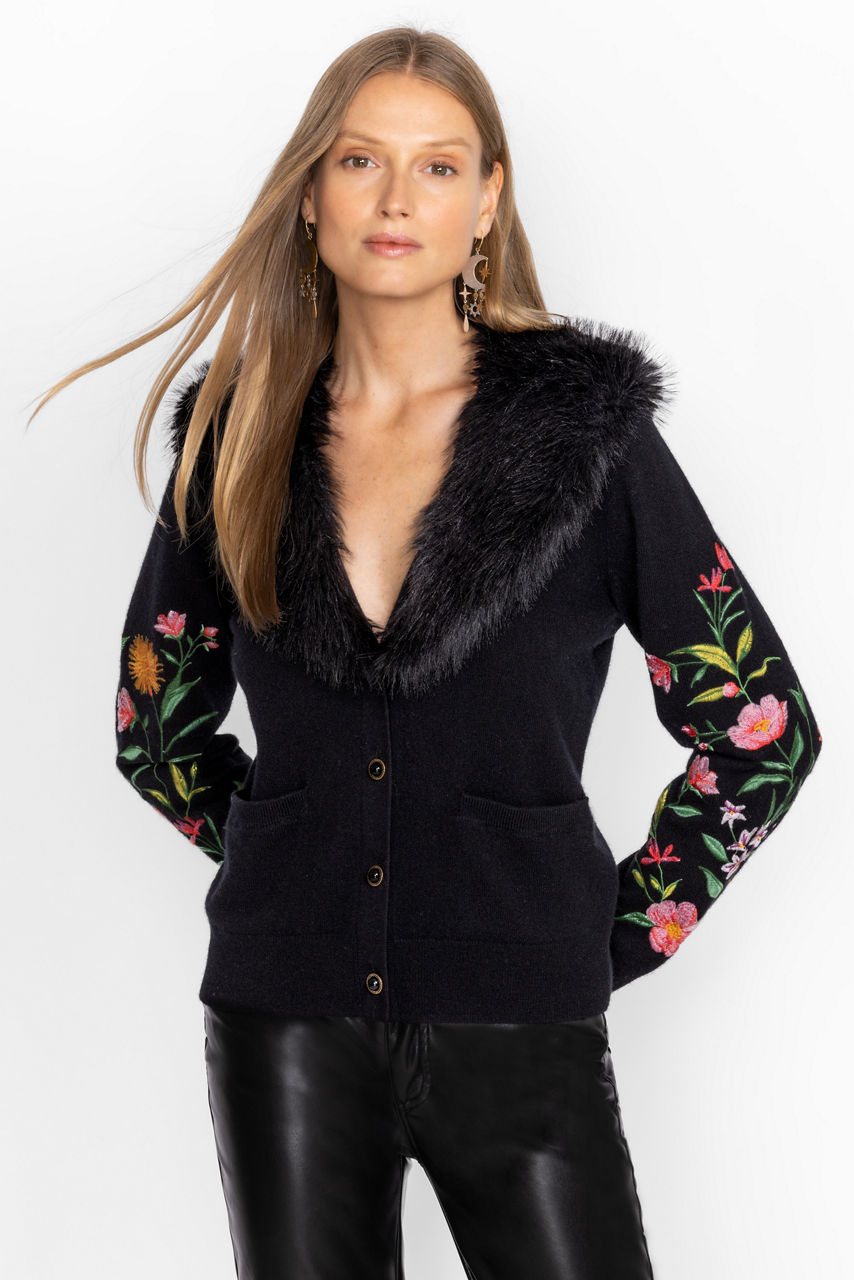 Designed from a cozy wool cashmere blend, the Vista Faux Fur Collar Cardigan reworks a functional layer into a bold statement piece. Imagined in black, this cardigan features a button front, welt pockets, a lavish faux fur collar, and floral embroidered sleeves for a femme finish. Wear this cardigan with jeans during the week and dress up with silk separates at the weekend.