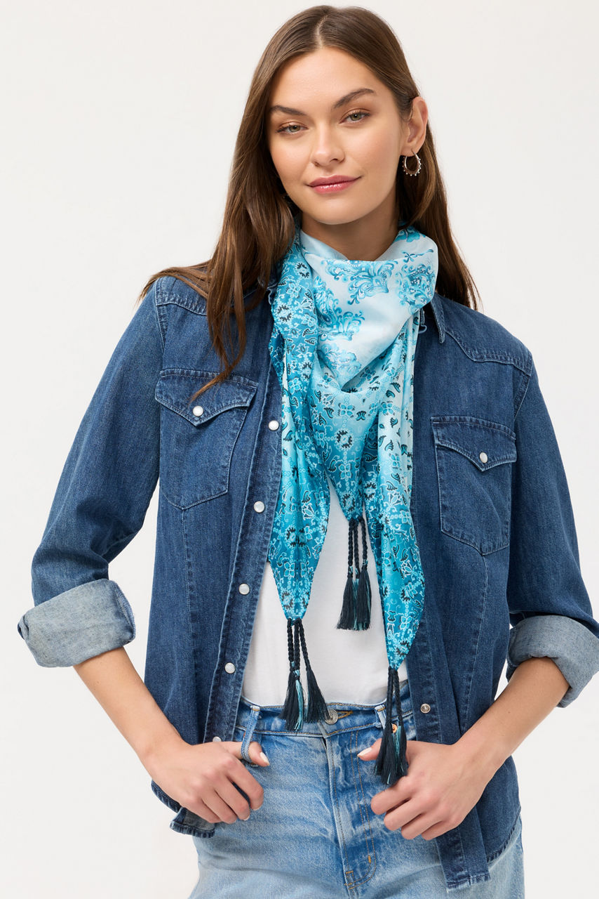 Crafted from luxurious 100% silk, the Vittoria Silk Scarf is a versatile accessory. Featuring a brilliant floral motif in varying hues of blue, this unique scarf is bordered with bold lines enhanced with intricate eye-catching detail. Wear over your hair on windy days to maintain a perfect coiffed style.