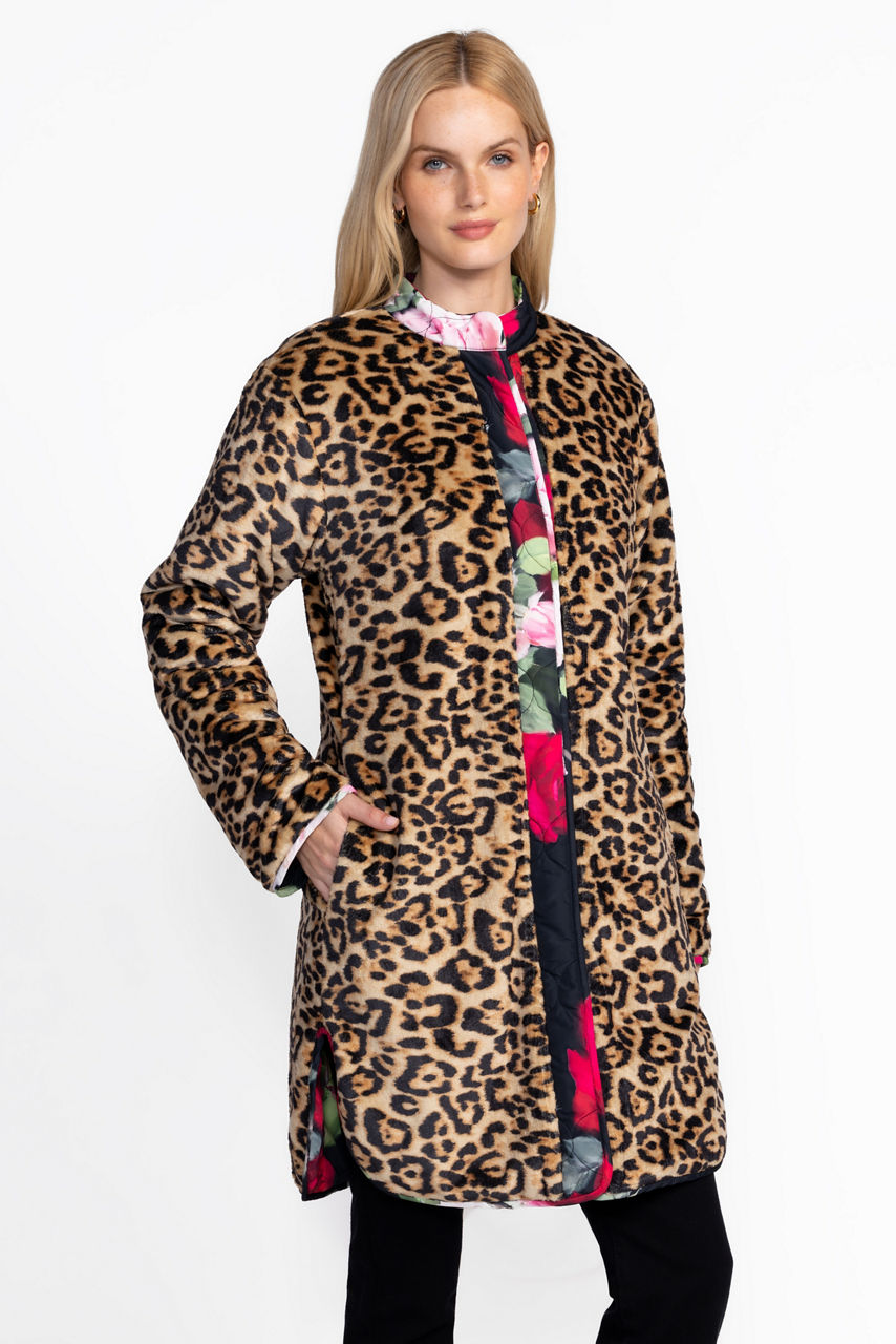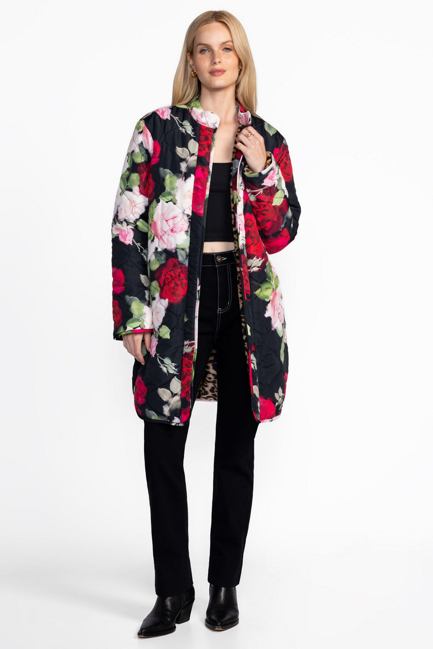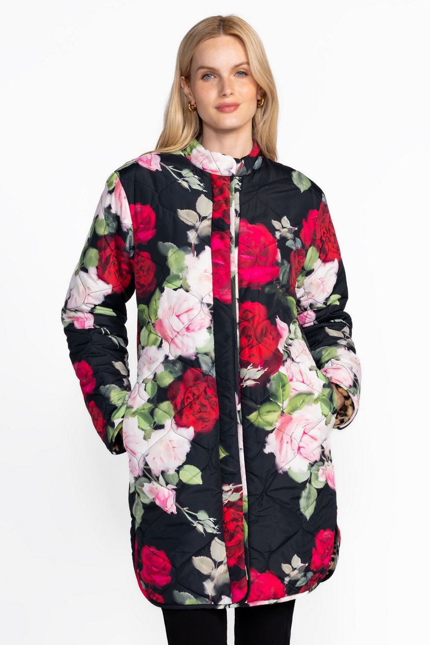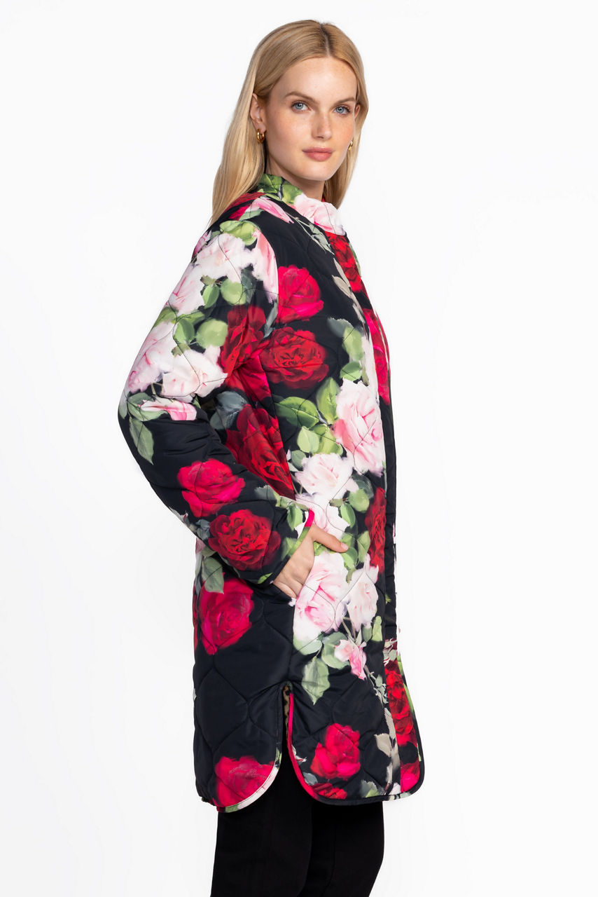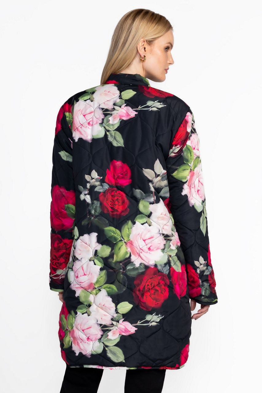 Embellished with vibrant roses in bloom, the Vivi Puffer Jacket is equal parts cozy and versatile. Featuring a standing collar and a snap-front closure, this fully reversible coat features two unique designs and is finished with an elegantly curved hemline. Layer over a classic dress and stylish heels for an evening look with a bold splash of color.