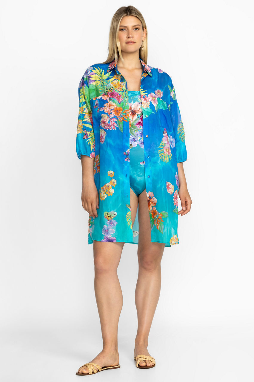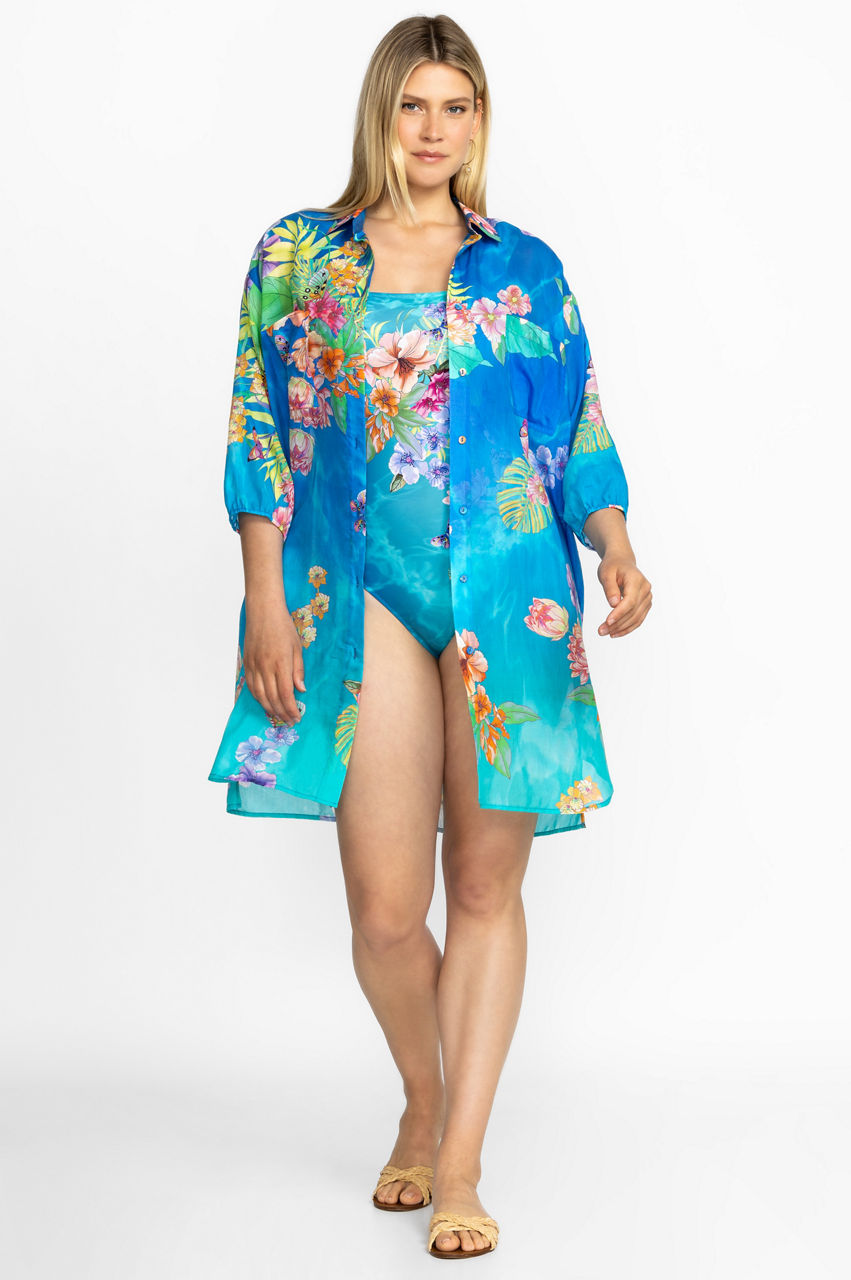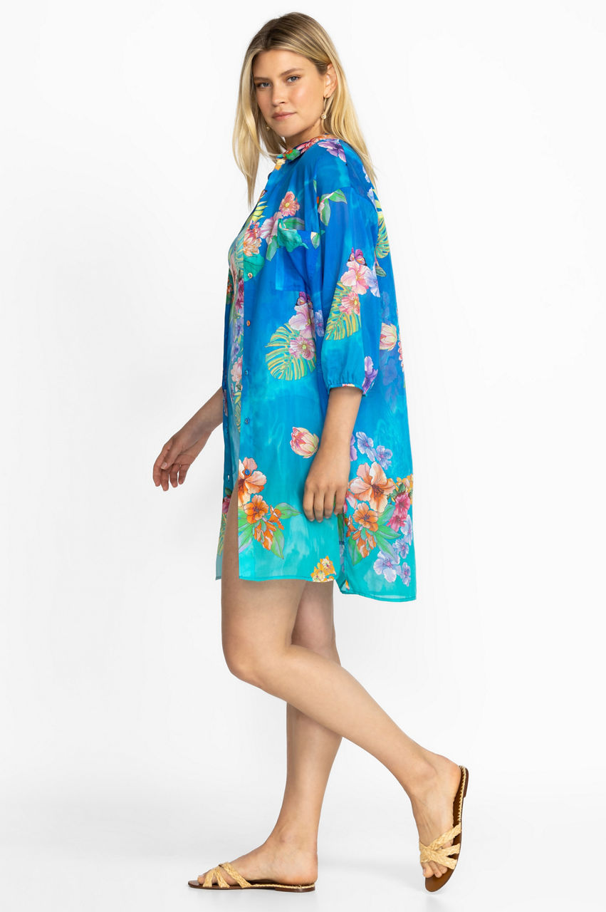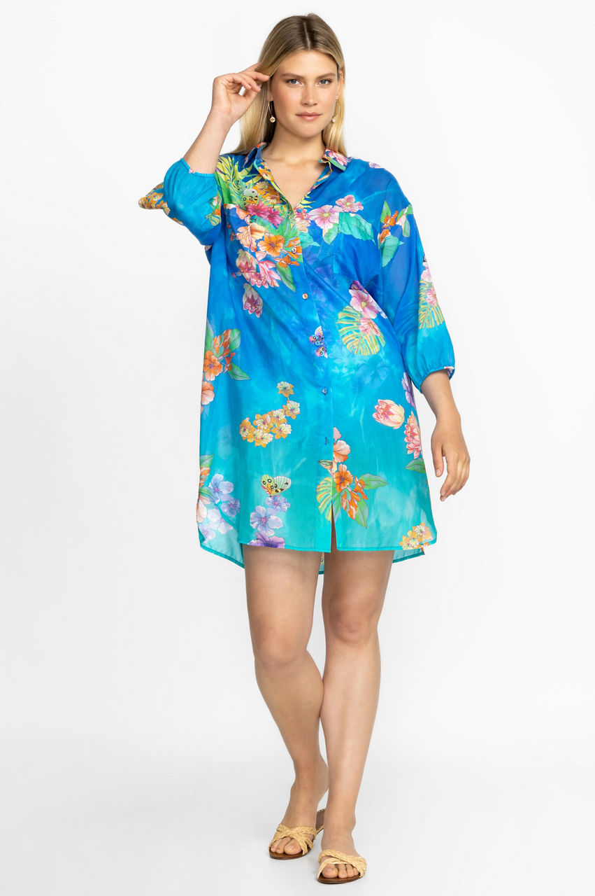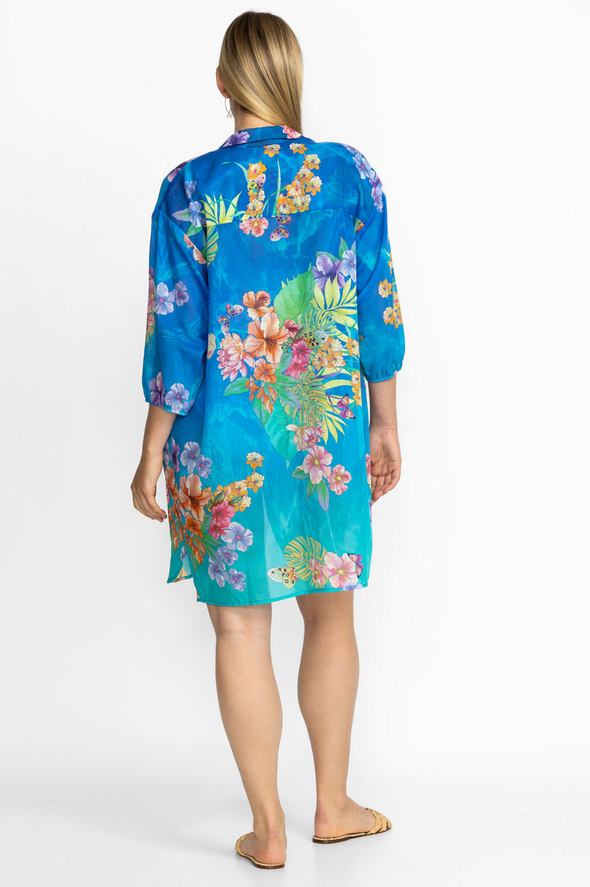 Calling to mind tropical beaches and rays of sunshine, the Water Tropical Shirt Dress is an eclectic addition to your vacation repertoire. Designed from a breathable cotton silk blend, this shirt dress boats a collar, short sleeves, patch pockets at the chest, and bright, exotic flowers in pink and green tones. Pair with slides and a beach bag for an upbeat ocean-ready look.