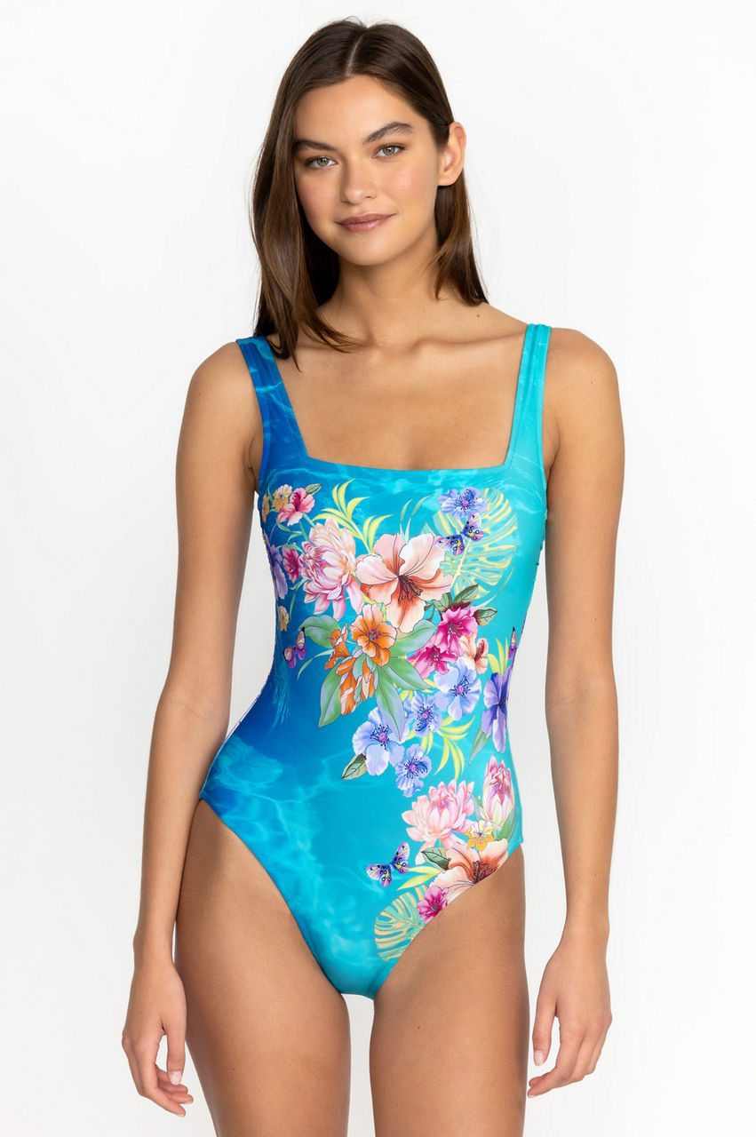 Enhanced by an intense color combination, the Water Tropic Square Neck One Piece merges a contemporary cut with a tropical aesthetic. This one piece is a stylish addition to your vacation capsule wardrobe and features a square neck, shoulder straps, full coverage, and exotic flowers for a joyful edge. Finish off the look with a pair of sunglasses for a chic poolside outfit.