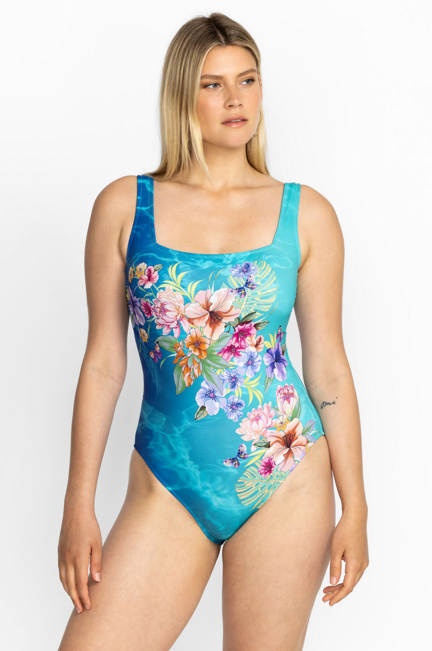 Enhanced by an intense color combination, the Water Tropic Square Neck One Piece merges a contemporary cut with a tropical aesthetic. This one piece is a stylish addition to your vacation capsule wardrobe and features a square neck, shoulder straps, full coverage, and exotic flowers for a joyful edge. Finish off the look with a pair of sunglasses for a chic poolside outfit.