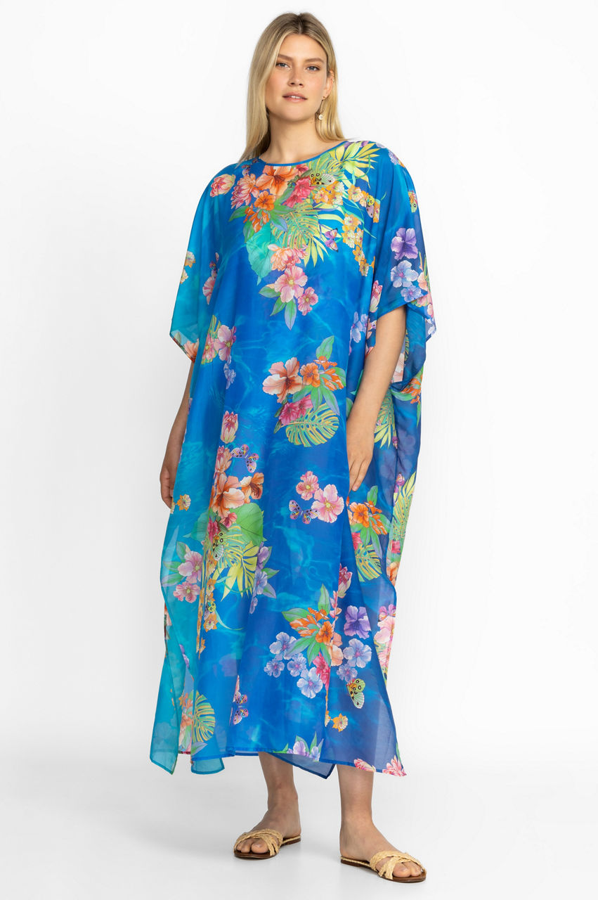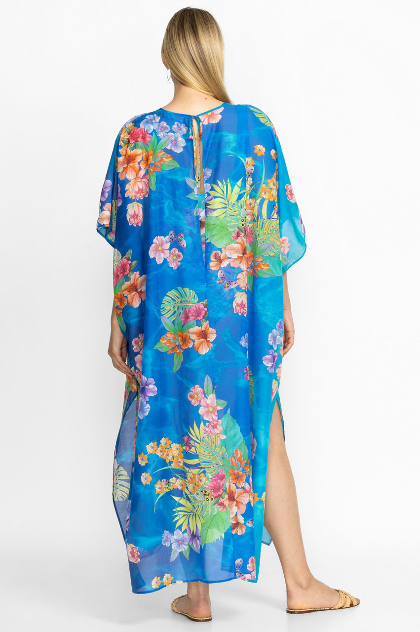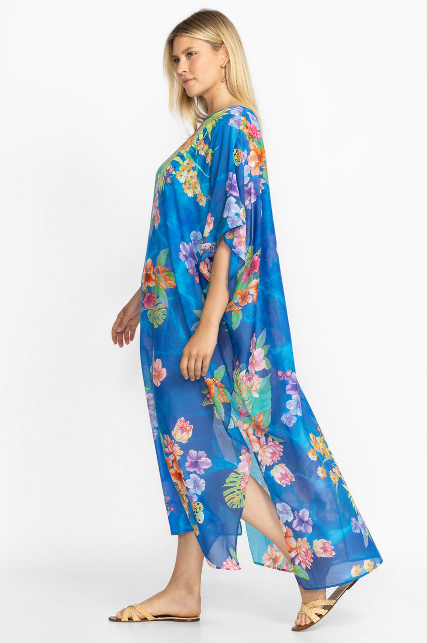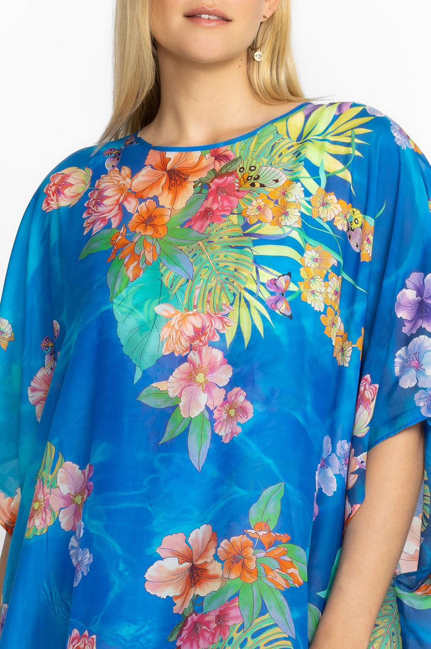 Designed from a comfortable cotton and silk mix, the Water Tropic Open Keyhole Kaftan is reminiscent of sparkling oceans and palm tree lined beaches. Embellished with vibrant florals, this blue kaftan features a round neck, short sleeves, and a split hem for relaxed movement. Simply throw on over a bikini and style with a pair of slides for a colorful vacation outfit.