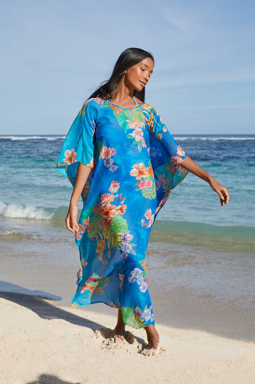 Designed from a comfortable cotton and silk mix, the Water Tropic Open Keyhole Kaftan is reminiscent of sparkling oceans and palm tree lined beaches. Embellished with vibrant florals, this blue kaftan features a round neck, short sleeves, and a split hem for relaxed movement. Simply throw on over a bikini and style with a pair of slides for a colorful vacation outfit.