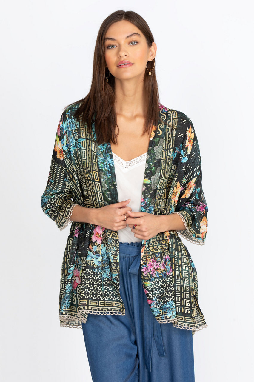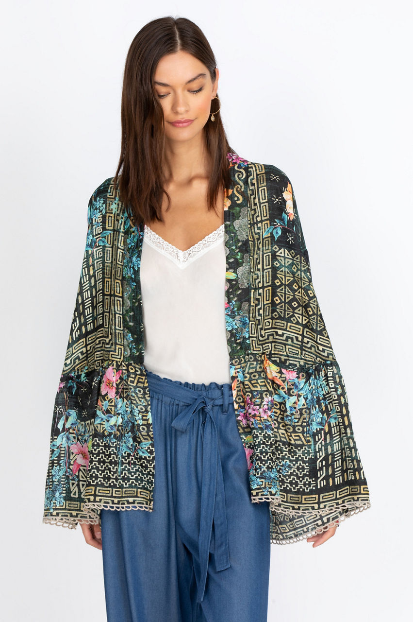 Go for the bold in the vibrant, traditionally styled Weller Tia Kimono. Our singular Johnny Was embroidered print serves as the perfect finishing touch to complete your look. Made from 100% silk and a snap closure for an accentuated silhouette, this kimono makes an optimal cover-up over your favorite swimwear at the beach or looks great with leggings for a casual occasion.