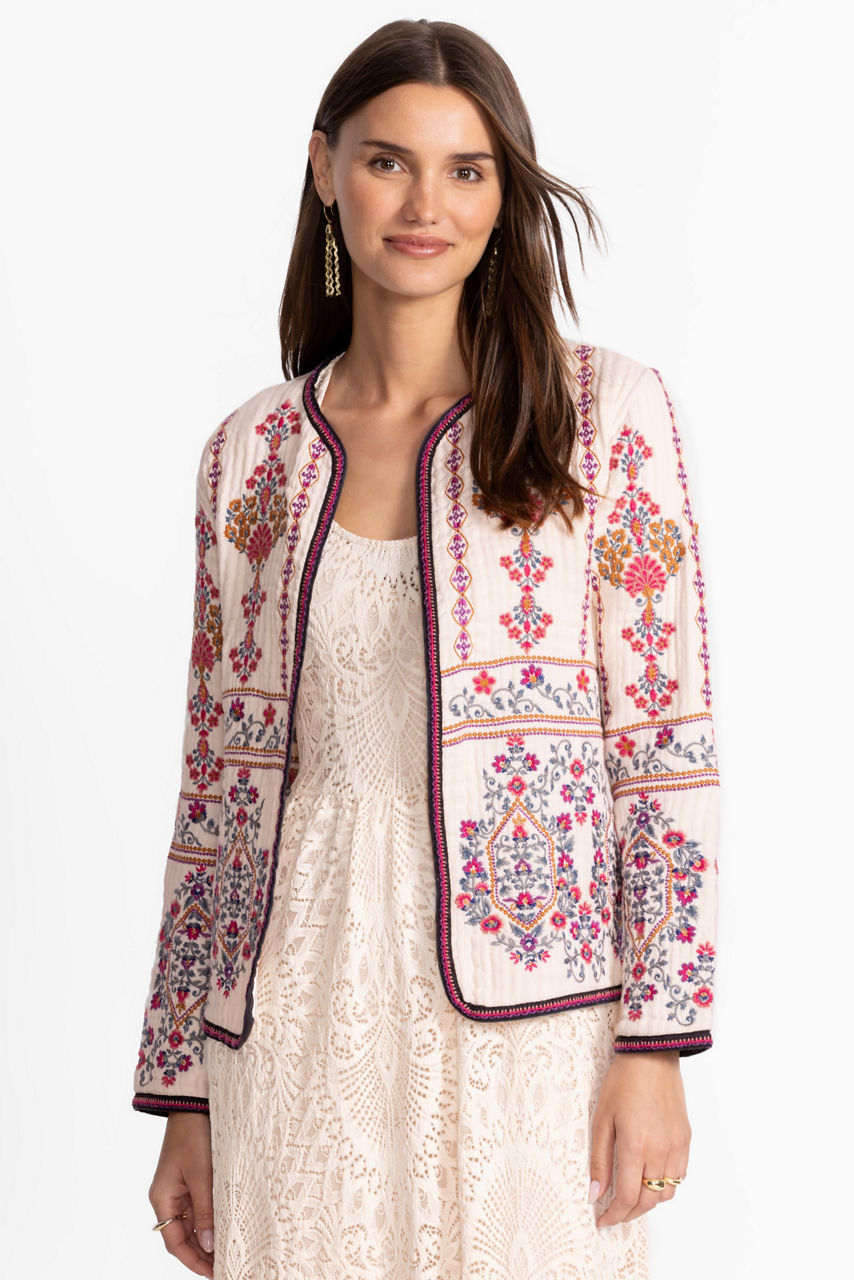 The Wendy Embroidered Jacket is crafted from breathable 100% cotton and designed for effortless elegance. Featuring an open front and long sleeves adorned with contrasting trim, this jacket comes to life with vibrant embroidered detailing. Layer it over a classic tee and pair with a flowing tiered skirt for a look that’s both relaxed and distinctly feminine.