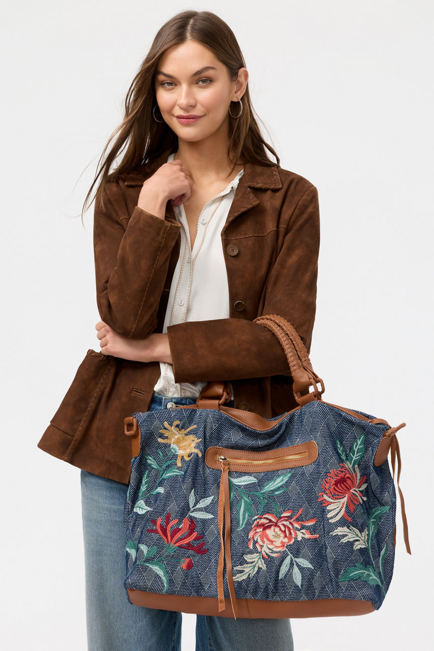 Crafted from rich 100% cotton, the Weslie Overnight Bag is beautifully embellished with a mesmerizing floral pattern featuring vibrant color. Designed with top handles and a long shoulder strap, this statement bag is finished with an exterior zippered pocket. Fill with all of your essentials and arrive in style for an overnight trip.