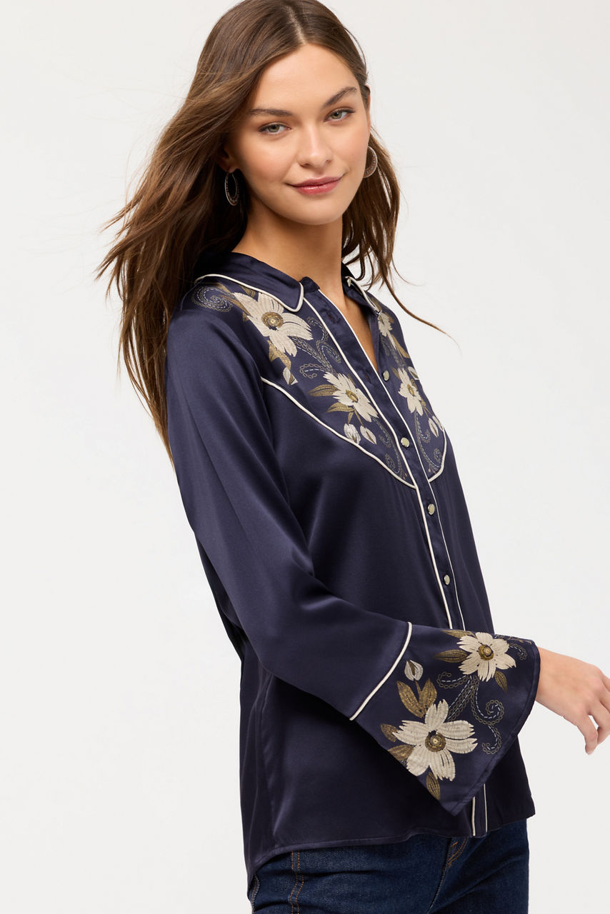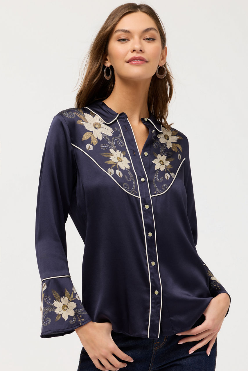 Embellished with bold floral blooms, the Corinthe Western Flutter Sleeve Blouse is crafted from a rich silk blend. Featuring a snap front closure and a western-style yoke, this blouse is finished with fluttering bell sleeves. Pair with dark-wash denim and western style boots for a fun night out with friends.