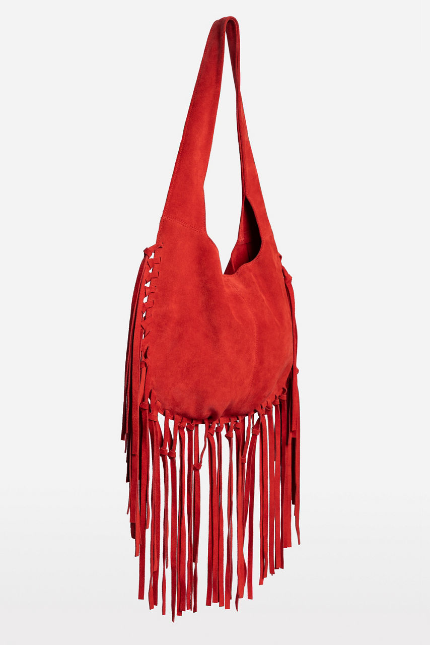 Crafted from rich 100% suede, the Western Italian Suede Fringe Bag adds a touch of sophistication to your casual wardrobe. Designed with a wide shoulder strap and classic hobo shape, this bag offers a front flap finished with a suede tassel fringe. Pair with denim-on-denim and trendy ankle boots for a fun girls' night out.