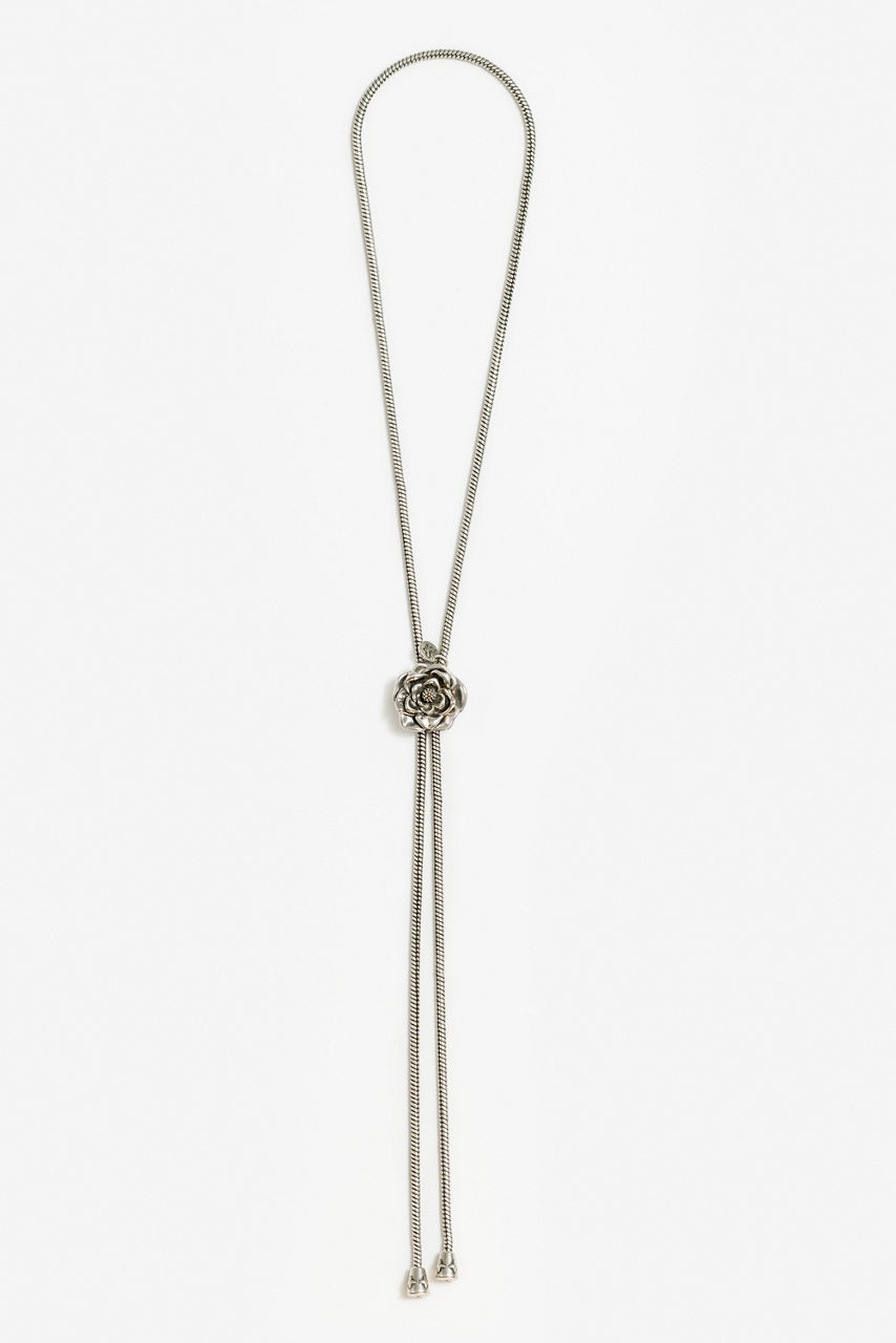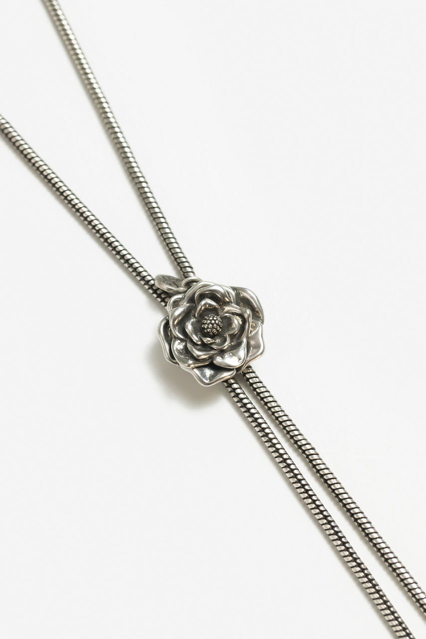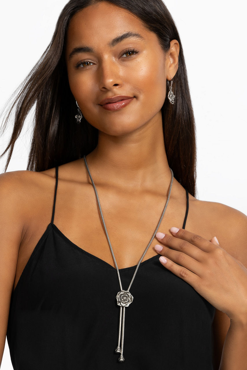 Inspired by traditional western styles, the Western Rose Bolo Tie adds a feminine touch to a traditionally masculine accessory. Thoughtfully crafted, this silver-tone rope necklace is connected with a beautifully designed rose accent at its center. Add to a denim button-front shirt and pair with a flowing maxi skirt for a modern take on western wear.