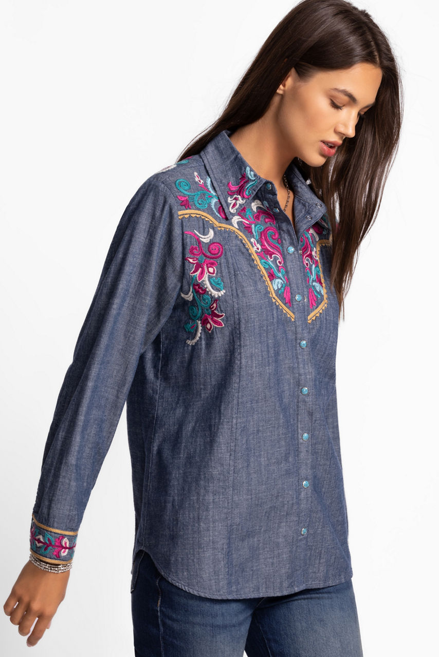 Crafted from 100% cotton, the Deidre Western Seamed Yoke Shirt is adorned with bold embroidered details in vibrant color. Designed with a traditional western yoke at the front and back, this button-front shirt features long sleeves and a snap front closure. Pair with a colorful maxi skirt and boots for a girls' night out.