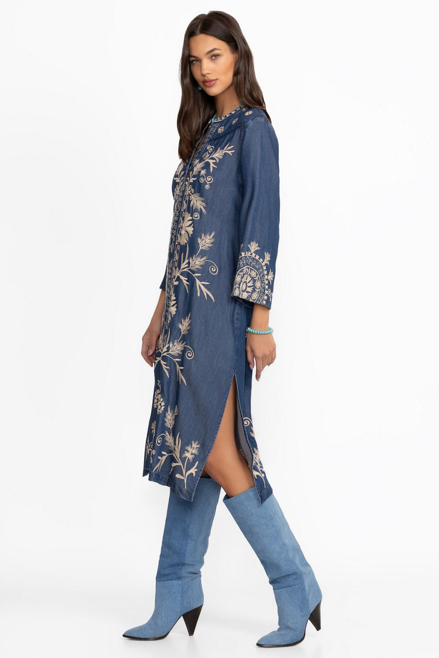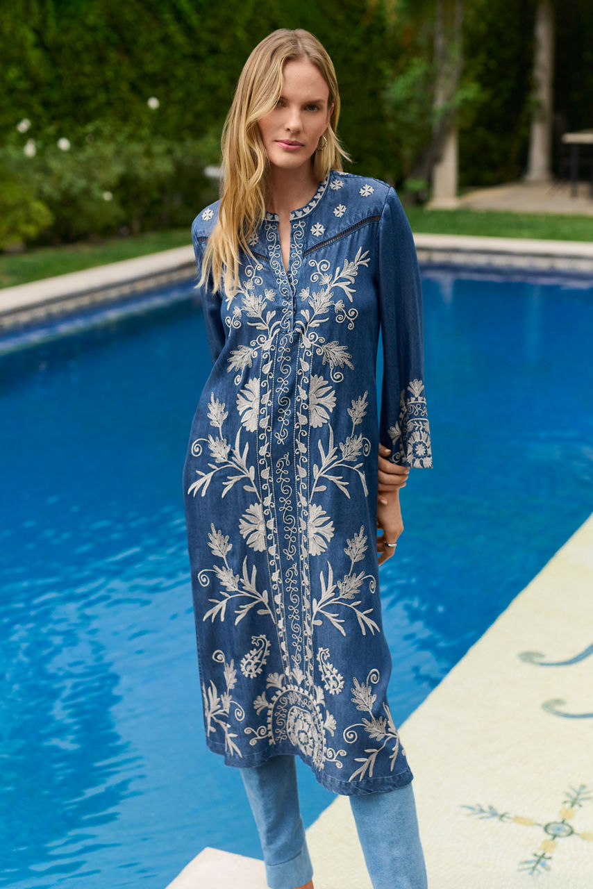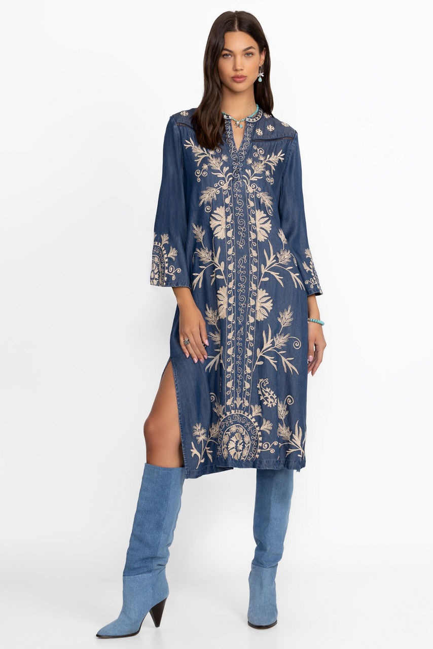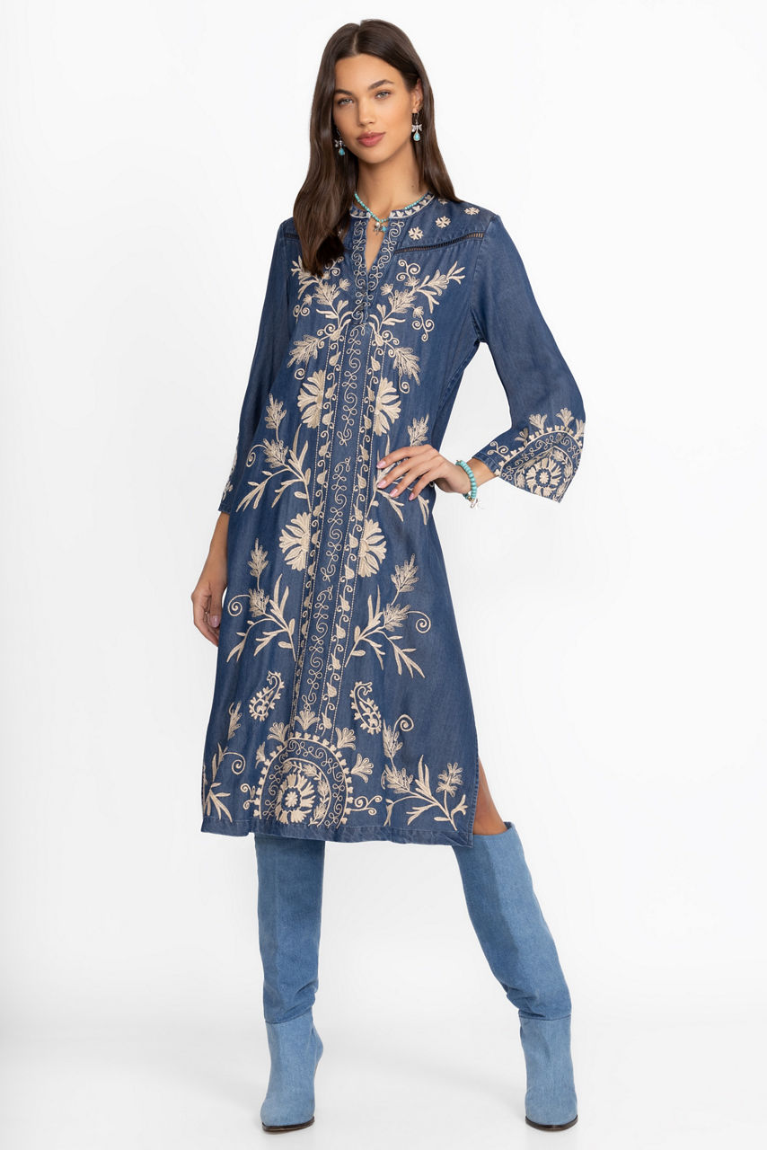 Crafted from a lightweight flowing fabric, the Western Trim Henley Dress is intricately embellished with floral embroidery and ladder lace trim. Featuring a distinctive western-style seamed yoke and a classic Henley neckline, this full-length dress is finished with bell sleeves and side slits. Pair with leather slides and bold silver jewelry for an eclectic look perfect for a relaxing casual day.