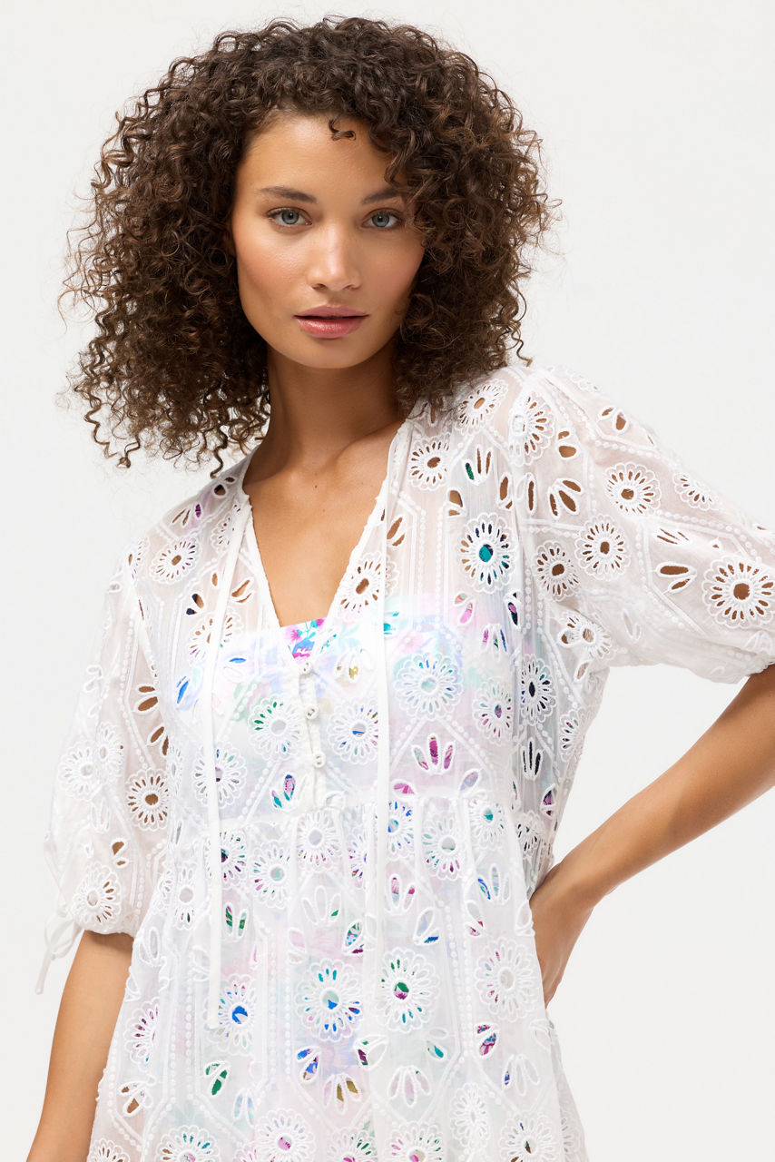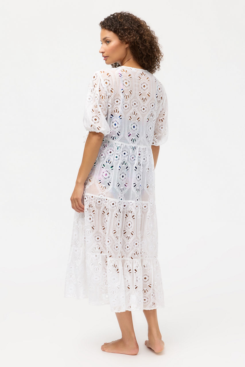 The Eyelet Tiered Maxi Dress captures effortless romance with its intricate embroidered eyelet fabric and breezy, tiered silhouette. Featuring a soft V-neckline, delicate front ties, and subtle shirring that adds movement and shape, it s an elevated coverup perfect for beach days or warm-weather strolls. Airy and elegant, it layers beautifully over swimwear for a polished, sun-soaked look.