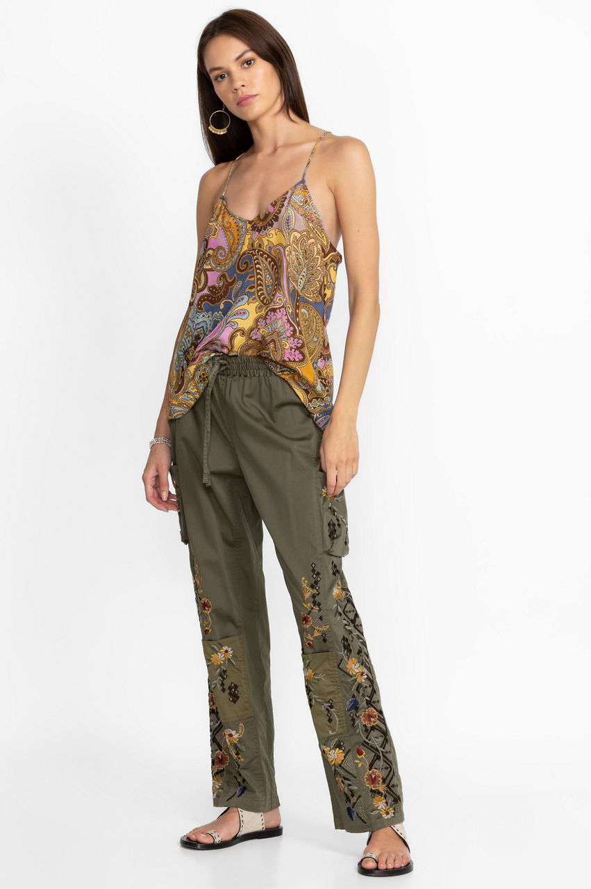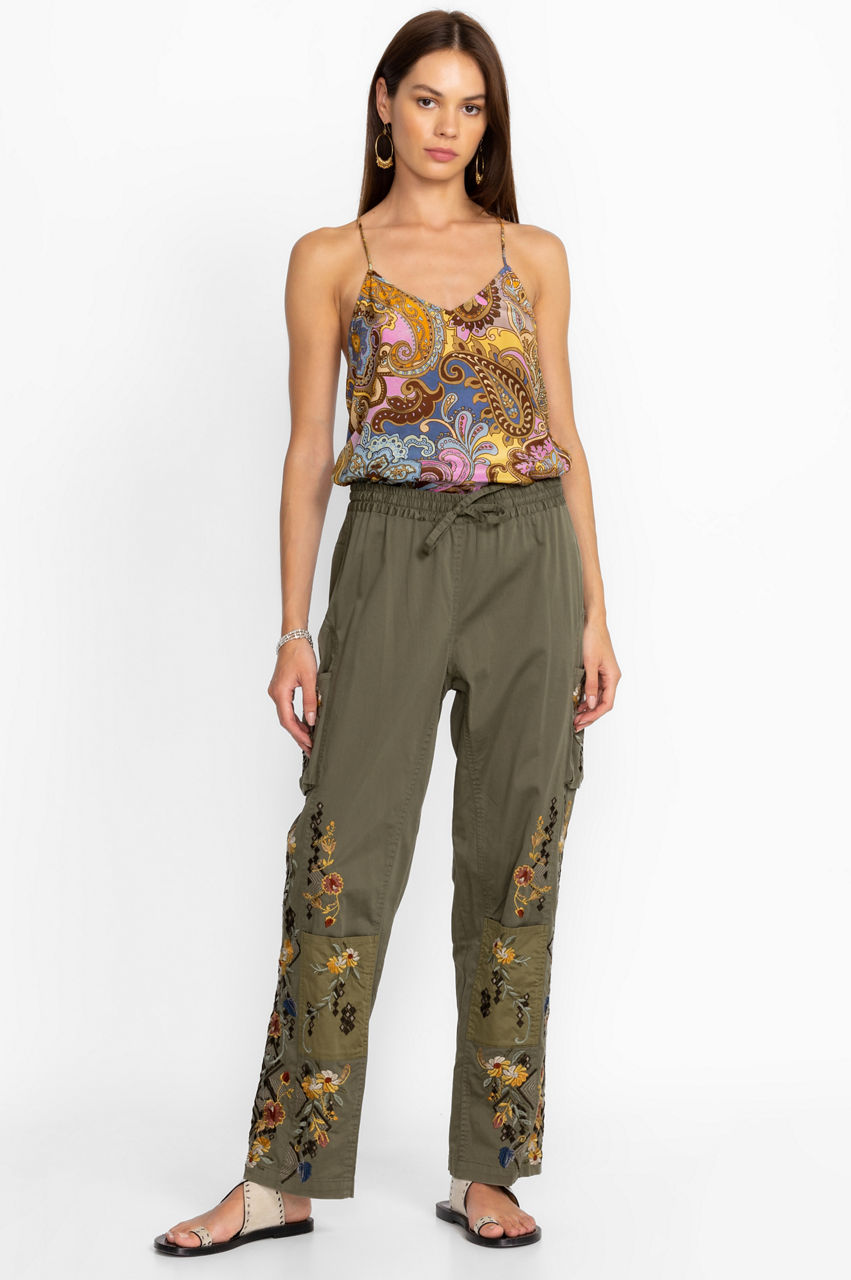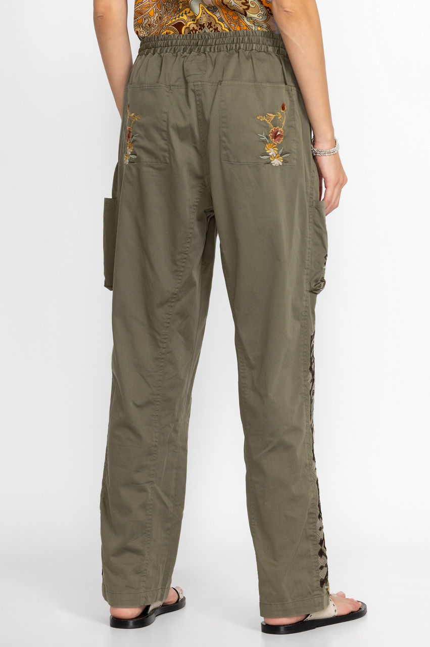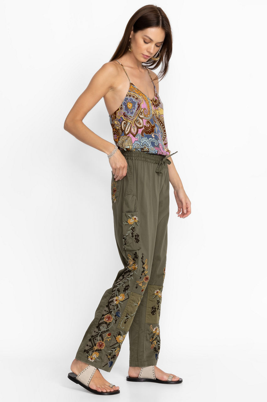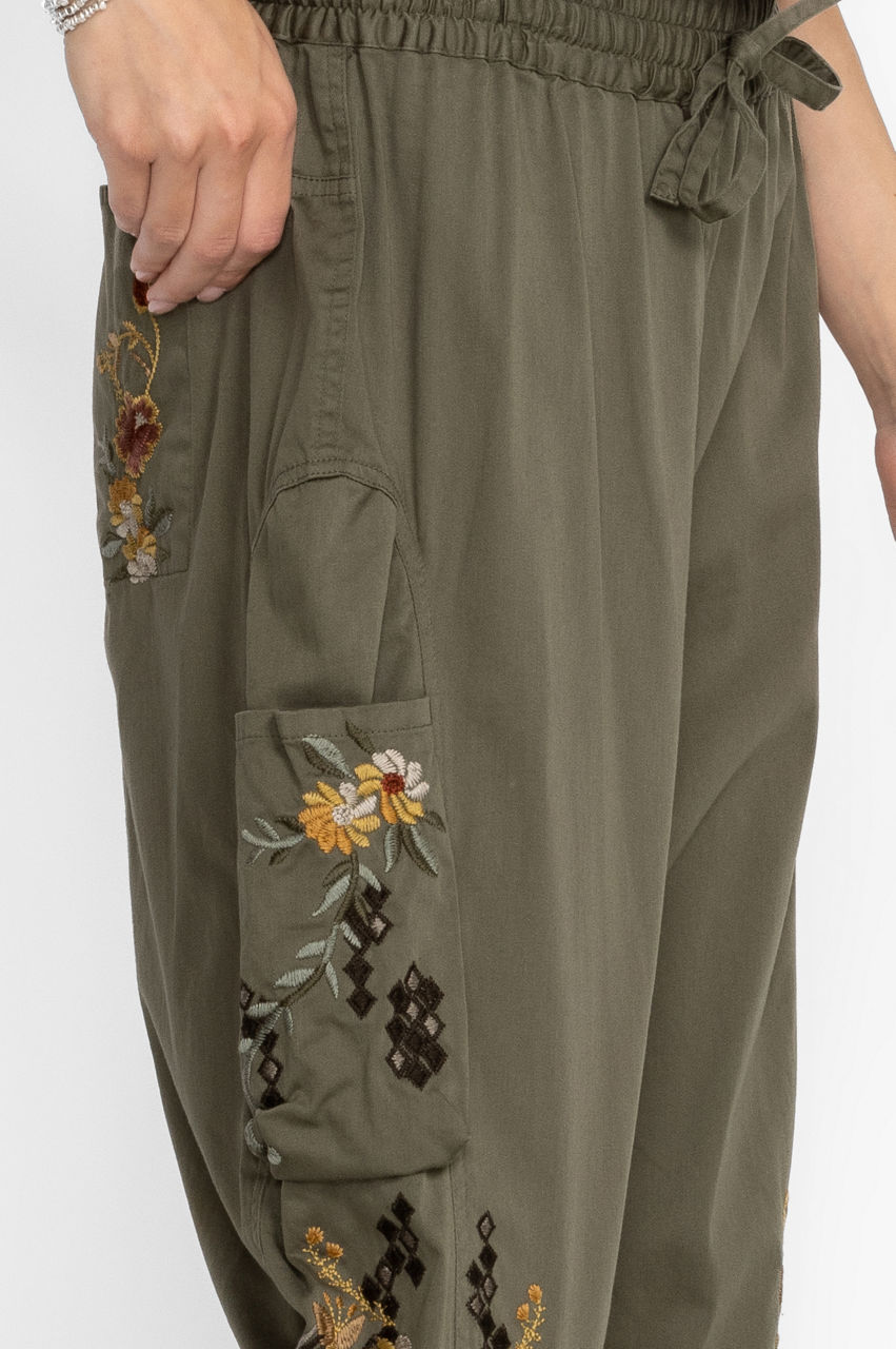 Designed from a comfortable cotton mix, the Whitney Pants redefine a utilitarian aesthetic with feminine touches. The perfect pick for daytime pursuits, these pants feature an elastic waistband with a belt tie, side and back pockets, and a detailed placement embroidery comprising dainty flowers.