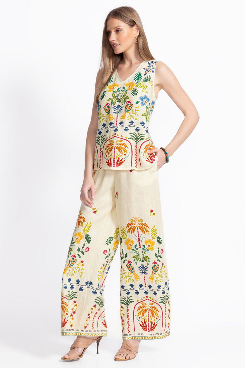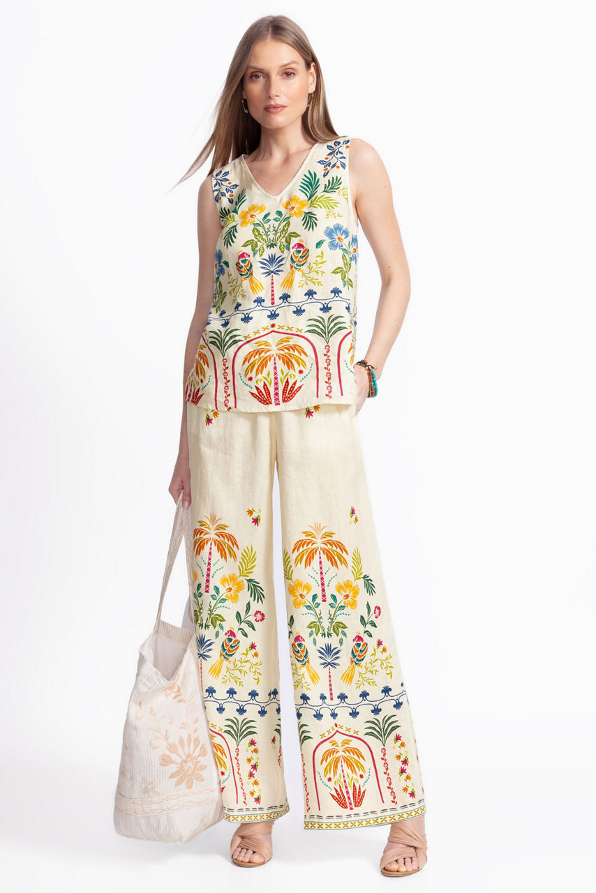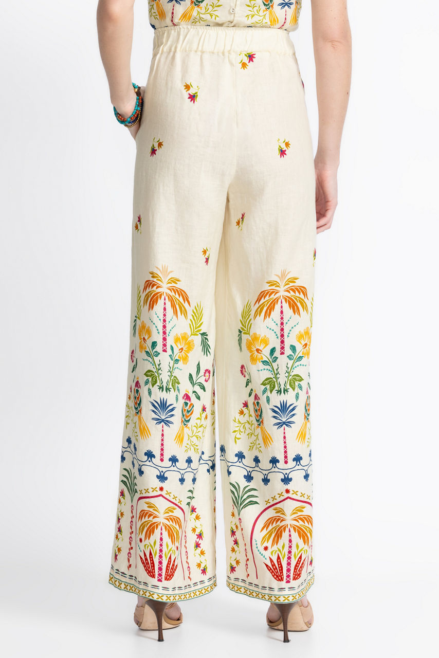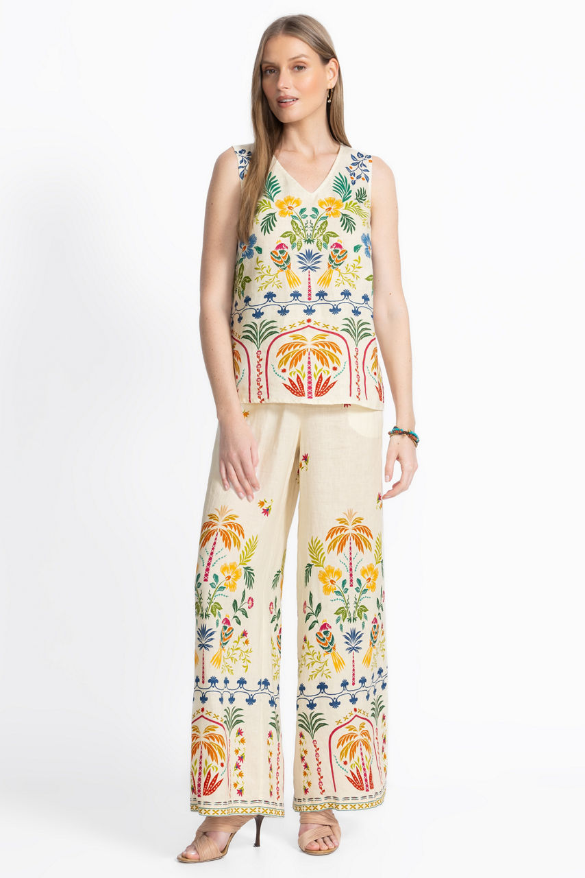 Crafted from 100% breathable linen, the Soller Wide Leg Pants are embellished with a vibrant kaleidoscope of color and pattern. Featuring an elastic waist and wide legs, these relaxed-fit pants are the epitome of elevated casual wear. Pair with a bright silk cami and strappy sandals for a resort-worthy look.