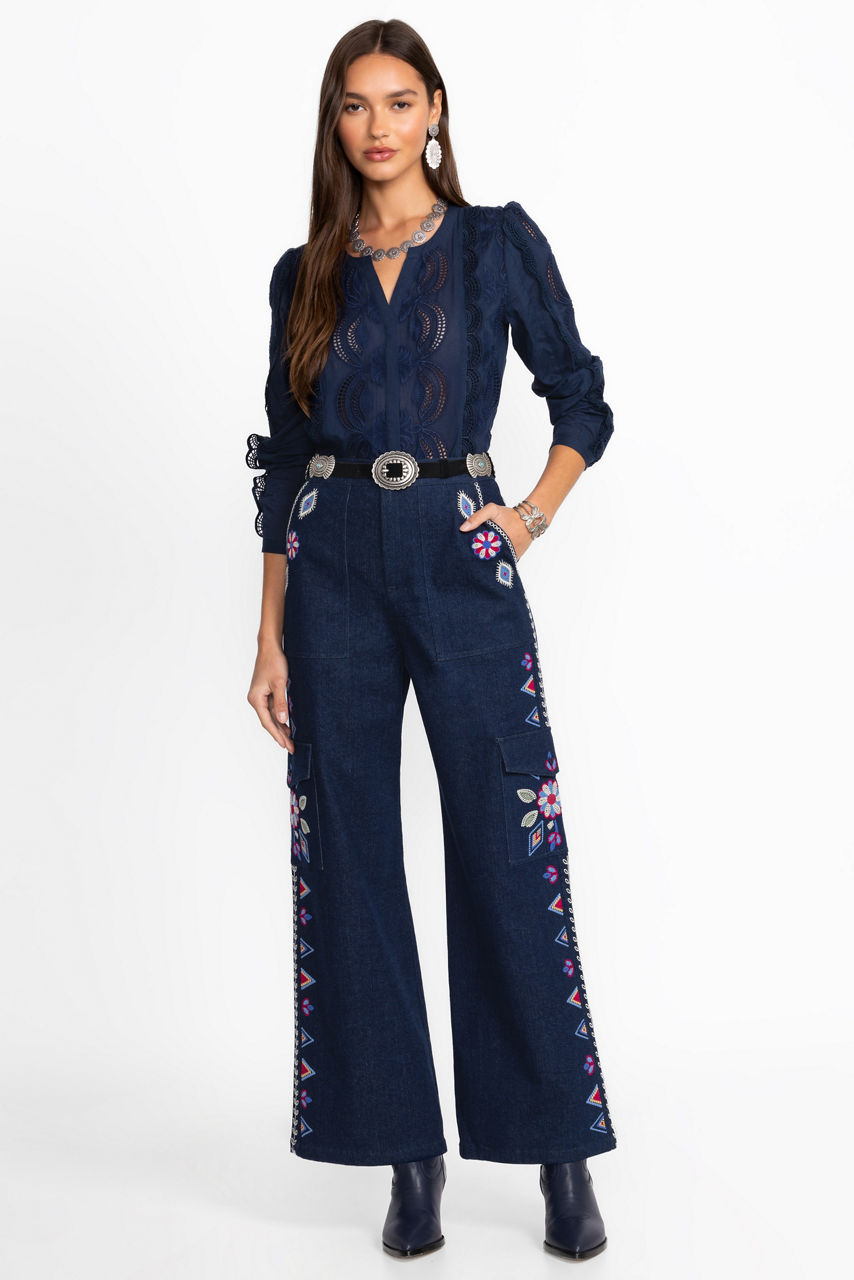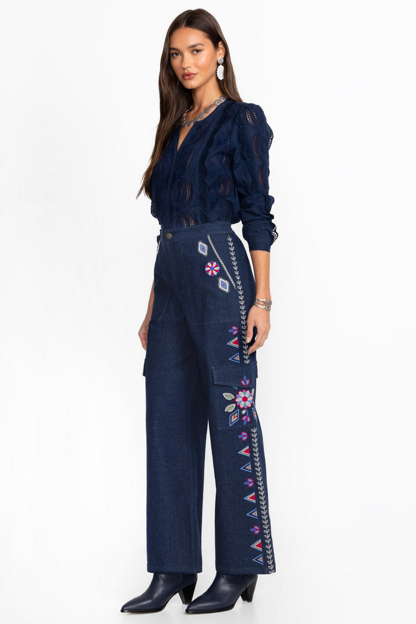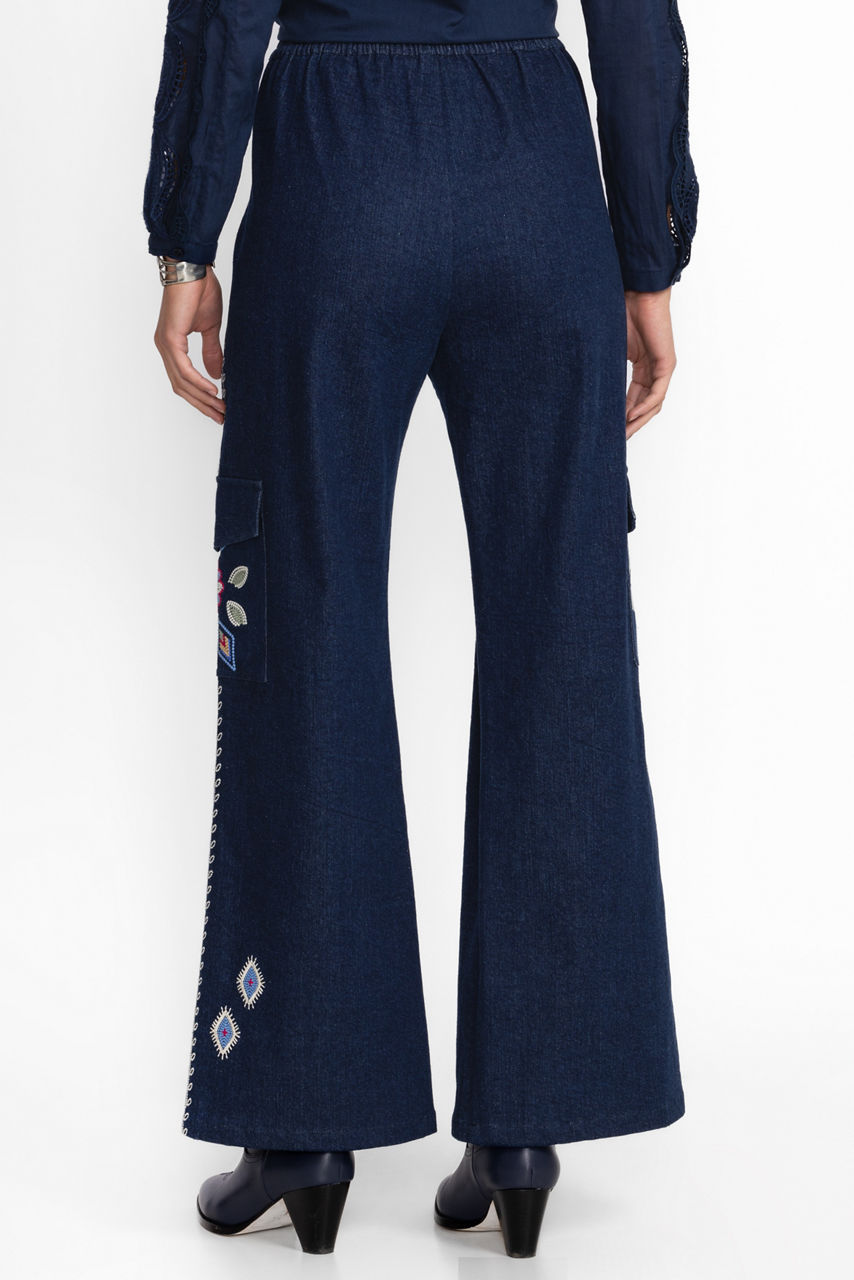 Crafted from 100% cotton, the Mila Wide Leg Pants offer an elevated alternative to traditional denim. Featuring a comfortable elastic waist and front fly closure, these wide-leg pants are finished with cargo pockets and colorful placement embroidery. Pair with the Mila Western Worker Jacket for a perfectly coordinated look.